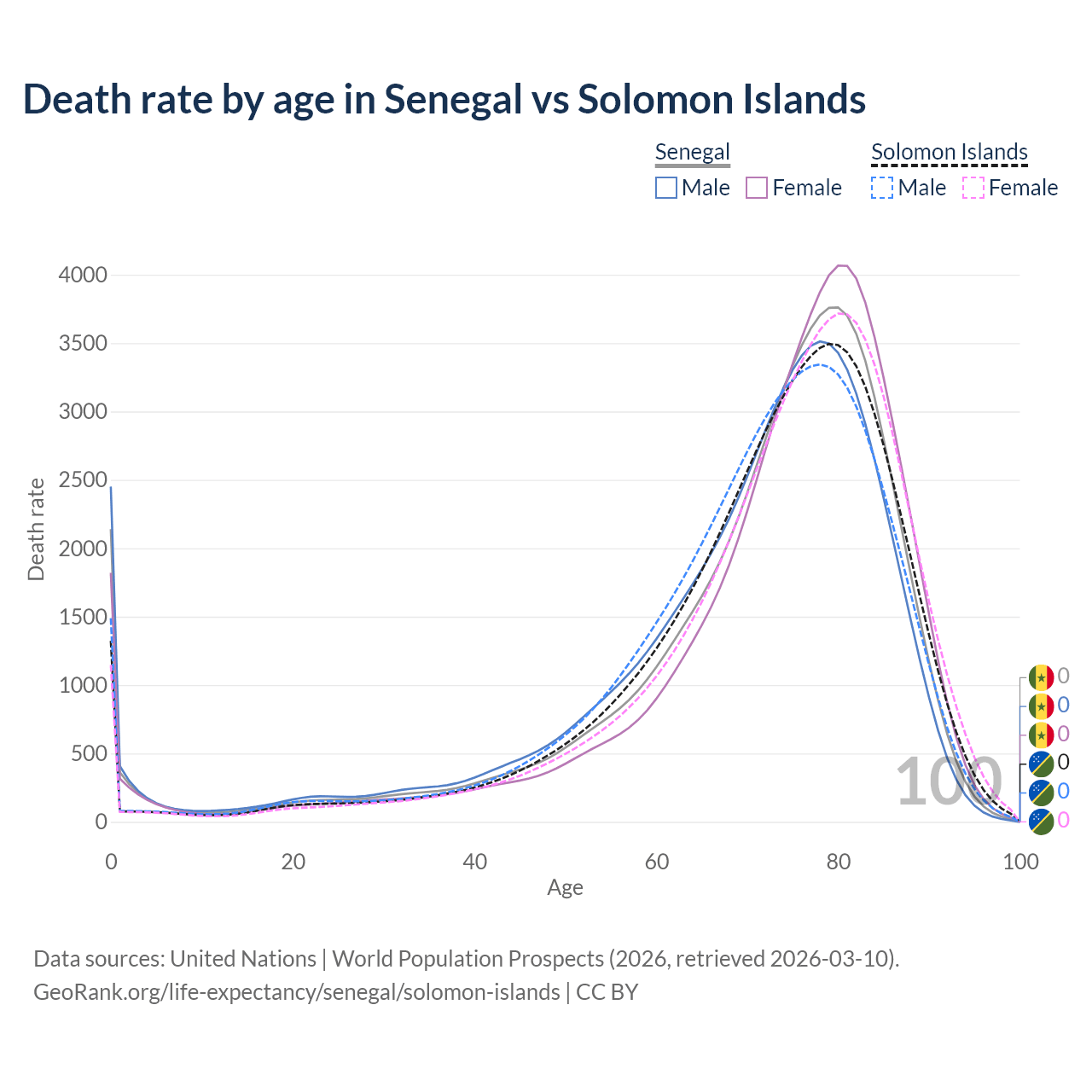 In Senegal, the most common age of death is 80, compared to 79 in the Solomon Islands. The median age of death is 75 in Senegal and 74.9 in the Solomon Islands, meaning only half of each cohort is expected to live past that age.