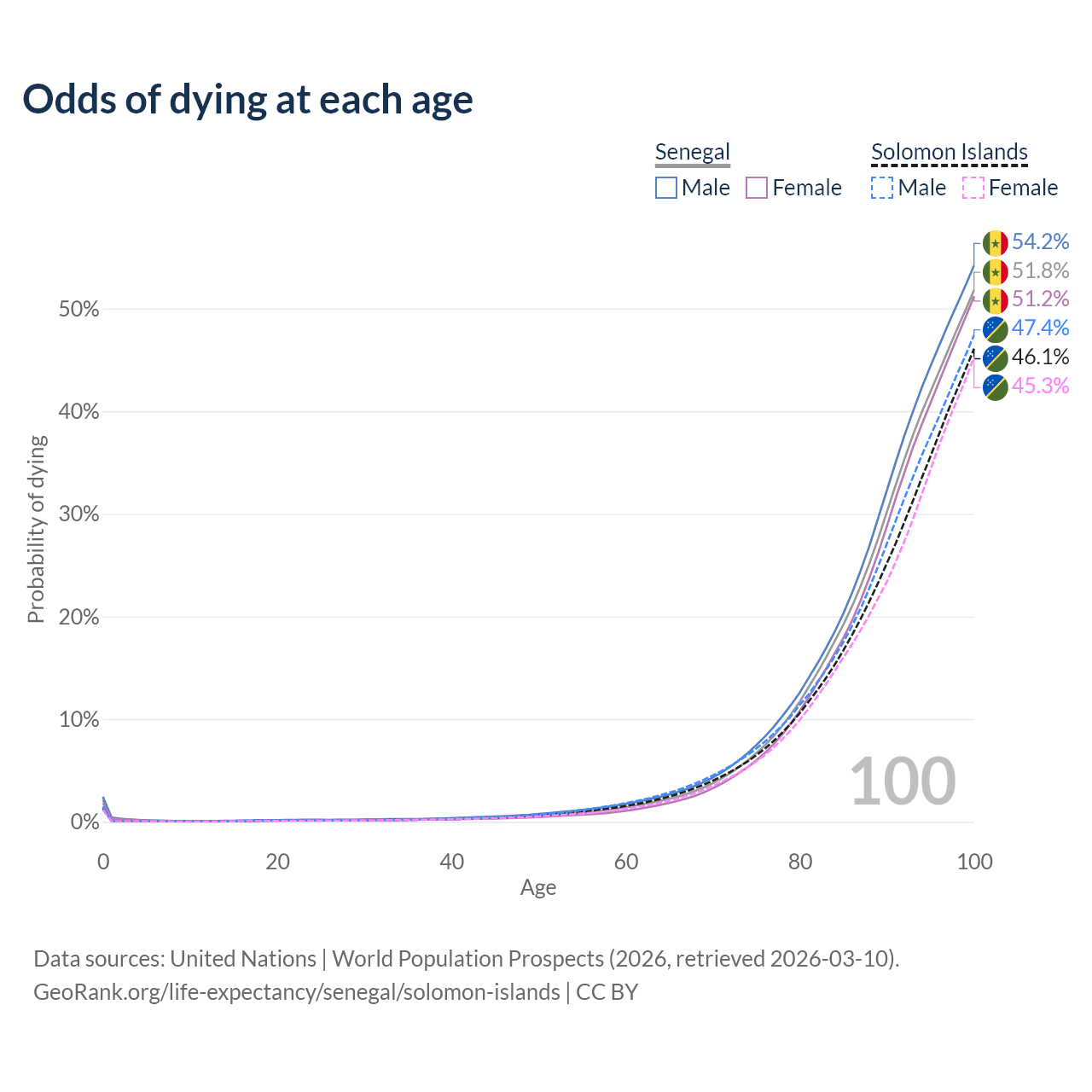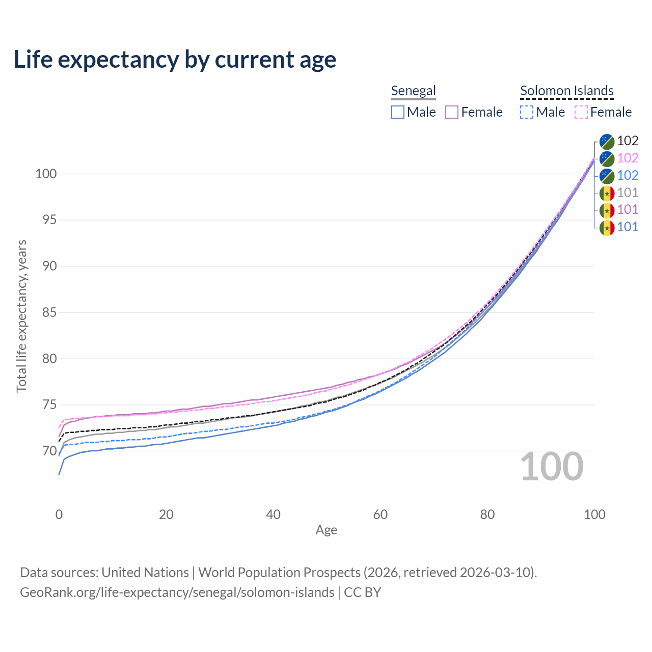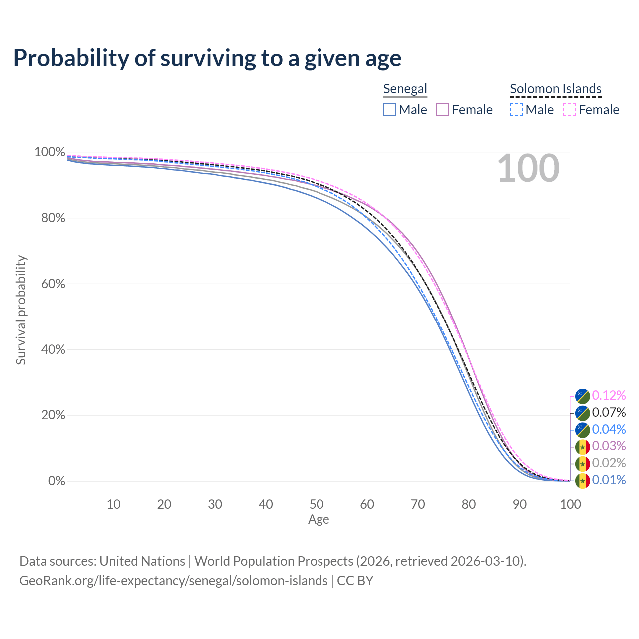 This life expectancy calculator shows the odds of living to 100, 95, 90, and below based on current age for both males and females in Senegal and the Solomon Islands, along with mean and median age of death. The calculations are based on the 2026 life tables (actuarial tables) from the UN World Population Prospects.
