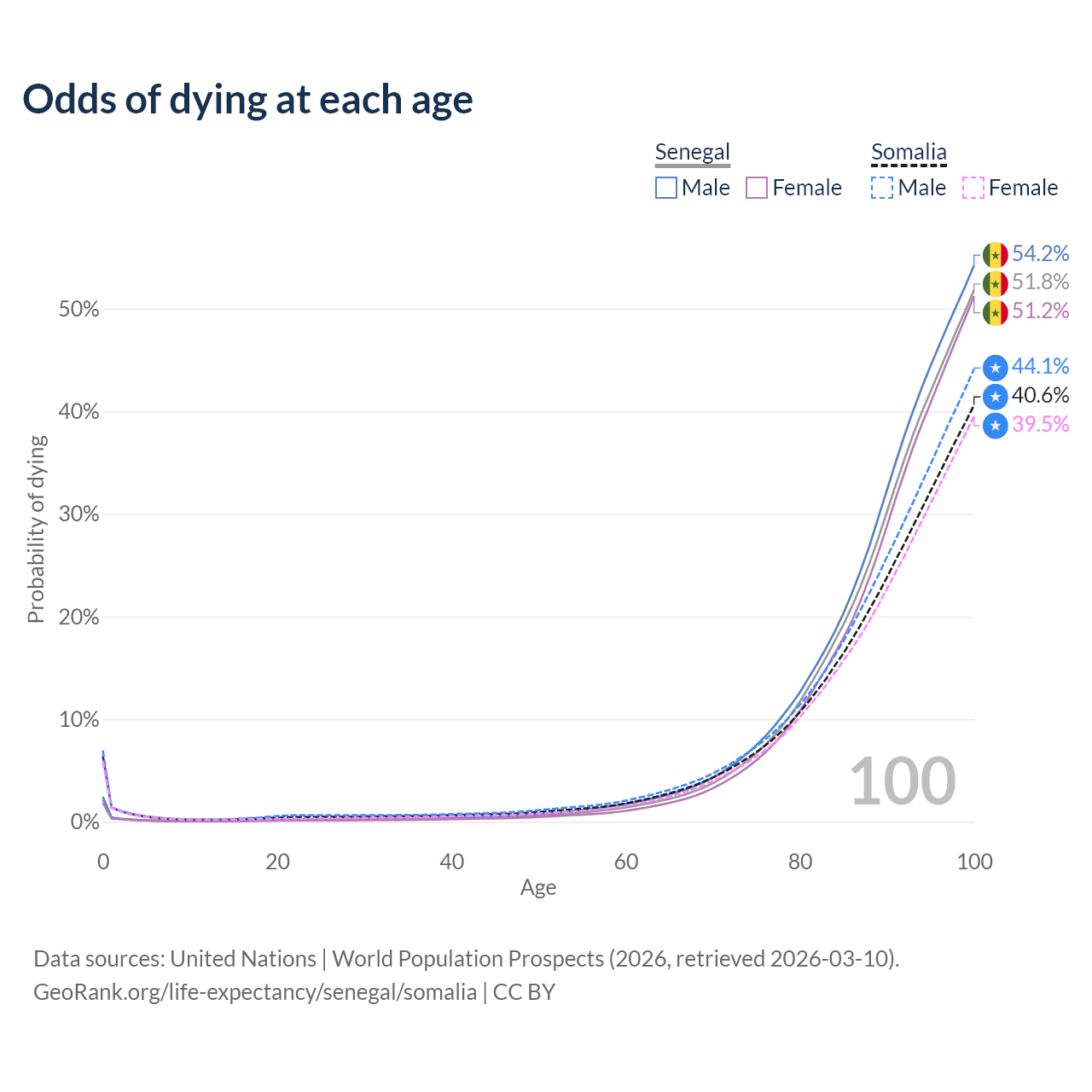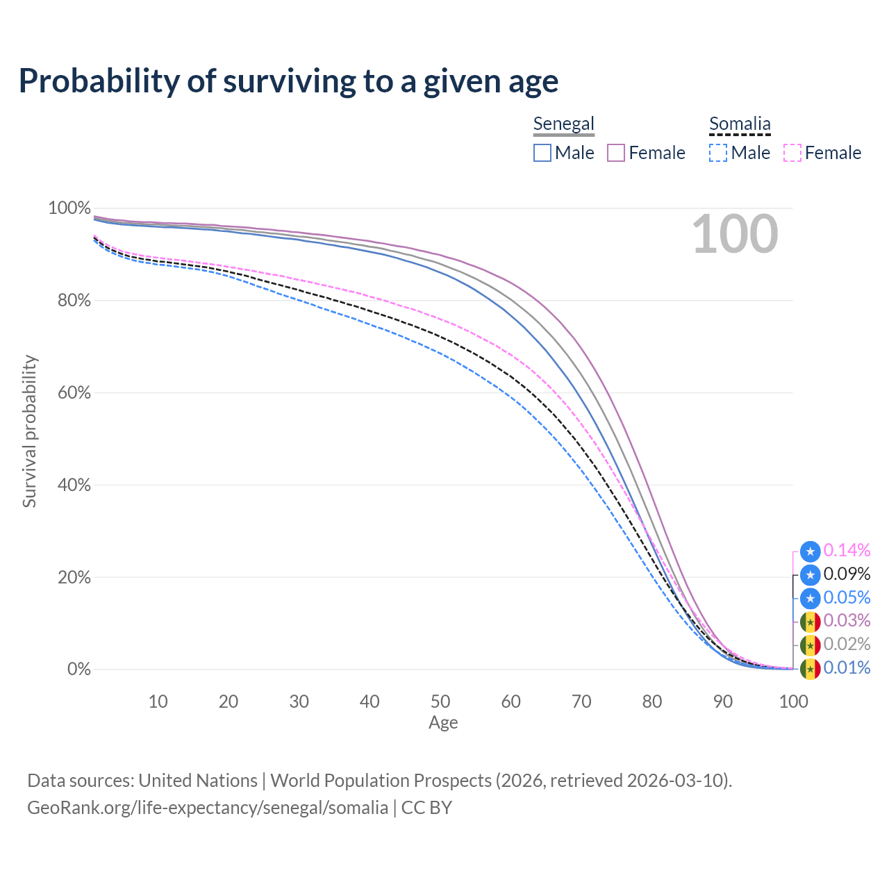 This life expectancy calculator shows the odds of living to 100, 95, 90, and below based on current age for both males and females in Senegal and Somalia, along with mean and median age of death. The calculations are based on the 2026 life tables (actuarial tables) from the UN World Population Prospects.