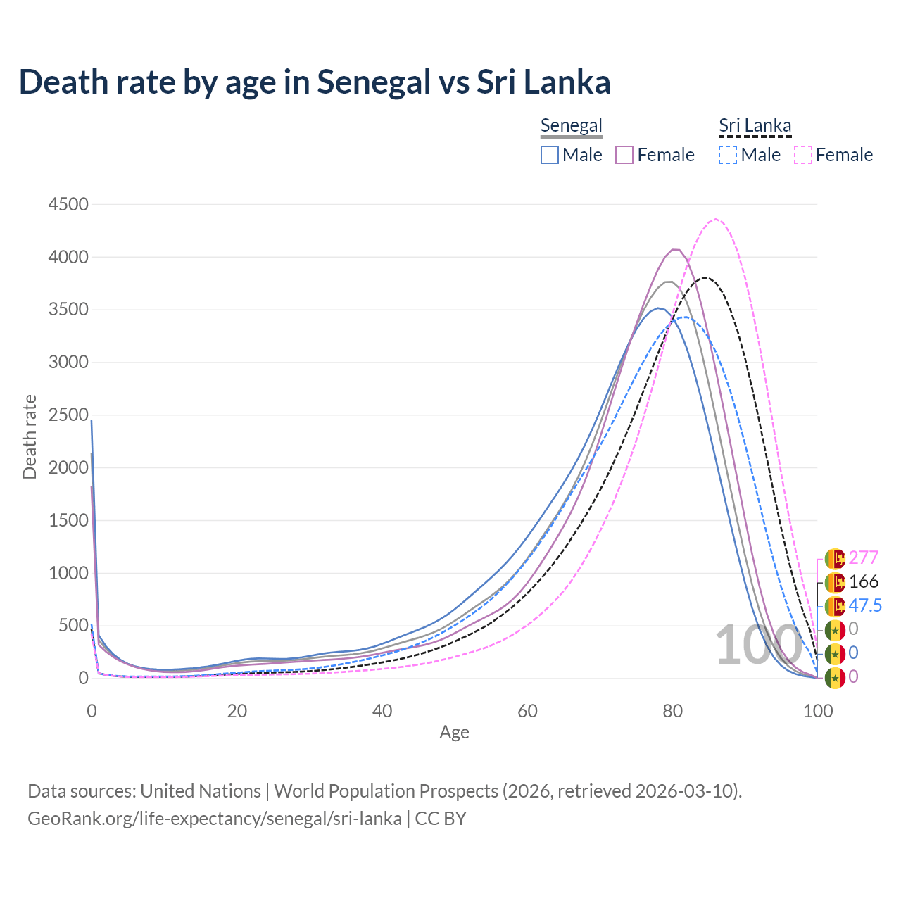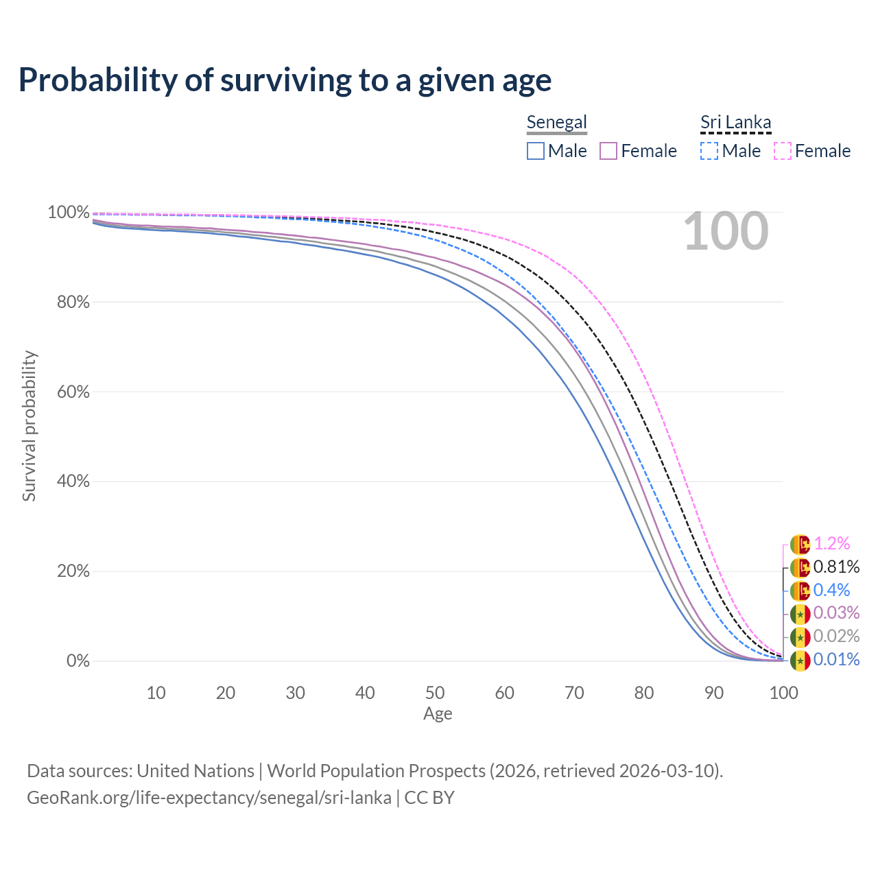 This life expectancy calculator shows the odds of living to 100, 95, 90, and below based on current age for both males and females in Senegal and Sri Lanka, along with mean and median age of death. The calculations are based on the 2026 life tables (actuarial tables) from the UN World Population Prospects.