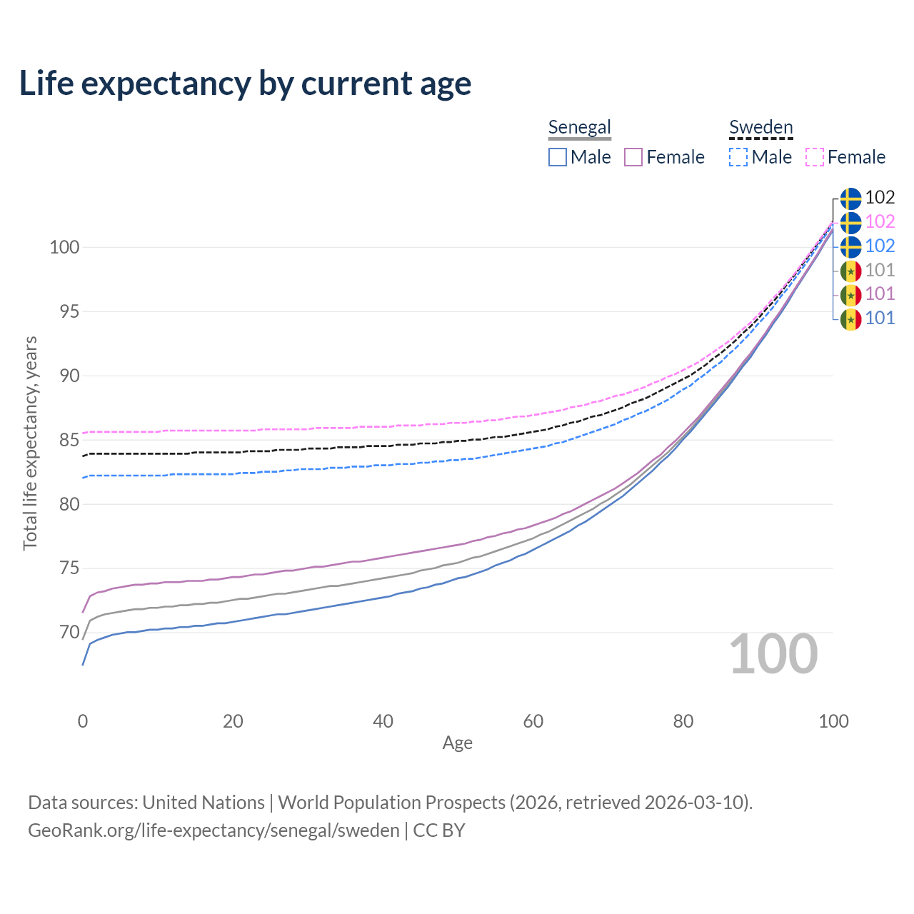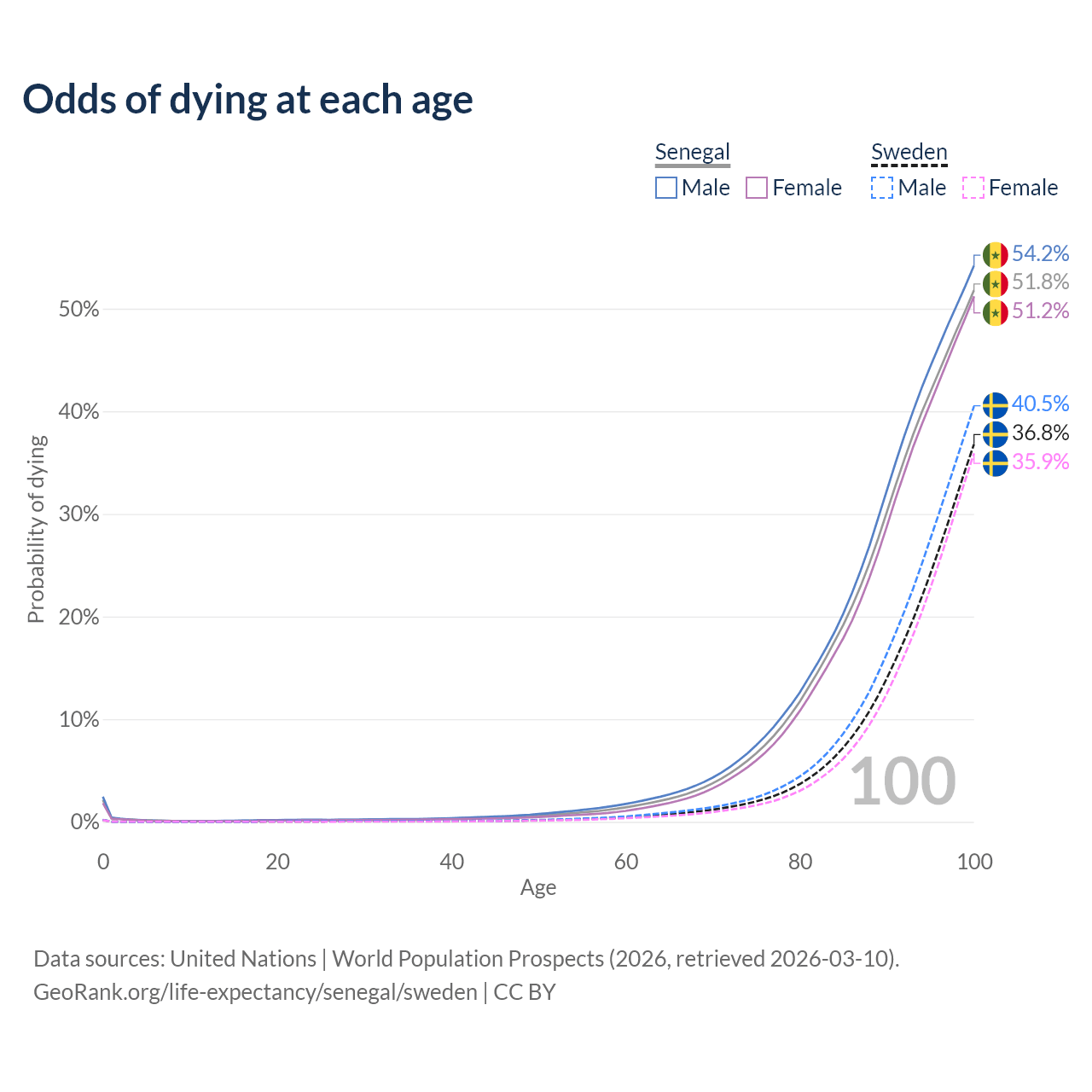 This life expectancy calculator shows the odds of living to 100, 95, 90, and below based on current age for both males and females in Senegal and Sweden, along with mean and median age of death. The calculations are based on the 2026 life tables (actuarial tables) from the UN World Population Prospects.