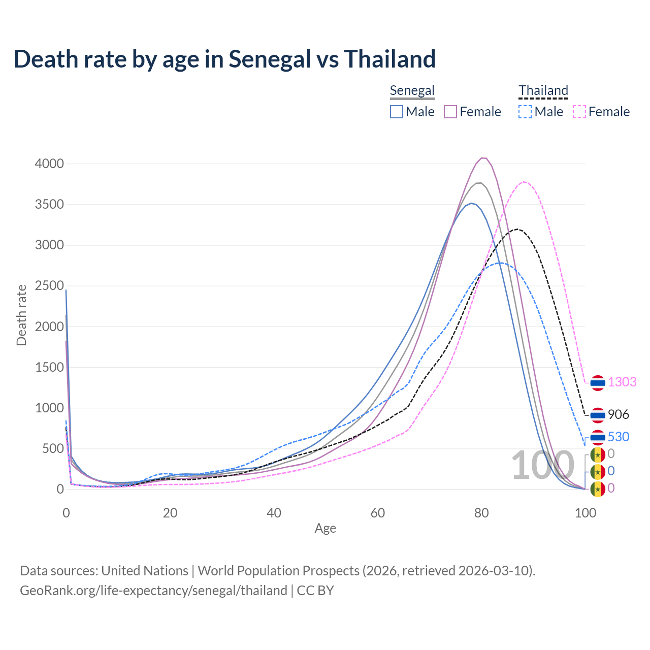 In Senegal, the most common age of death is 80, compared to 87 in Thailand. The median age of death is 75 in Senegal and 81.8 in Thailand, meaning only half of each cohort is expected to live past that age.