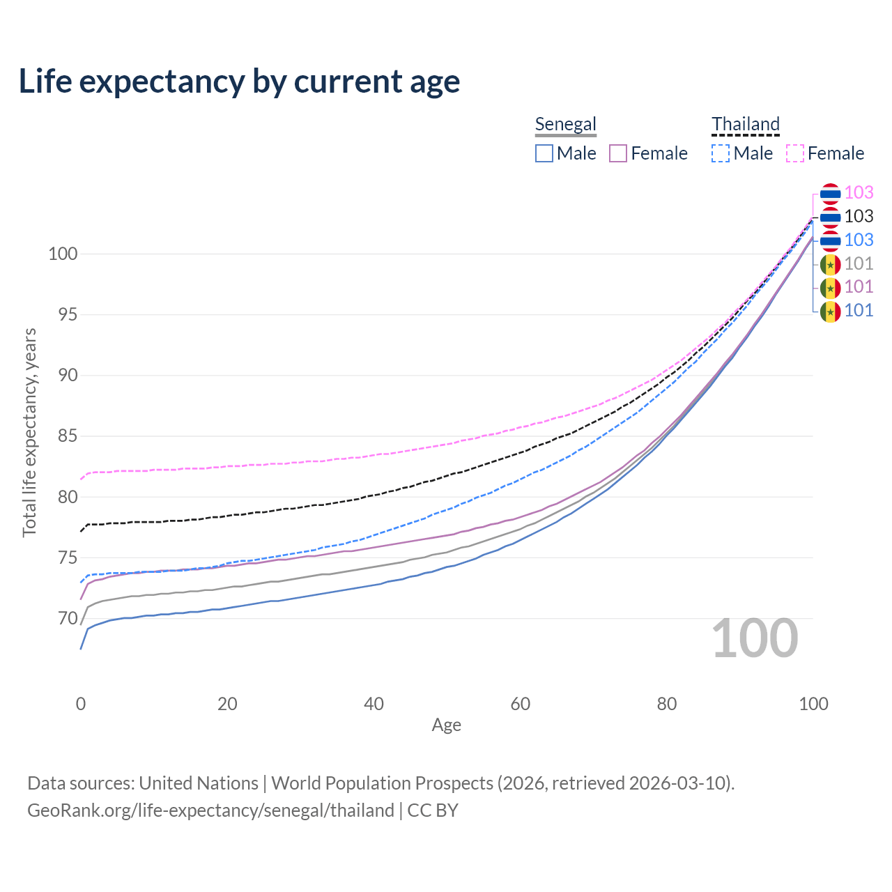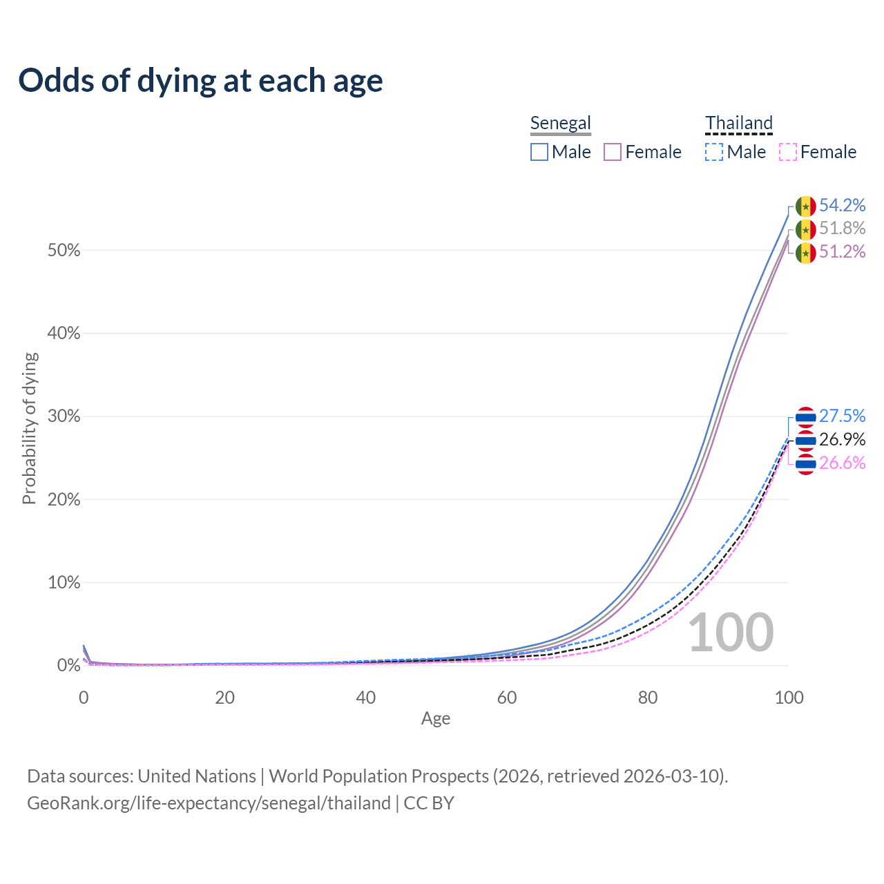 This life expectancy calculator shows the odds of living to 100, 95, 90, and below based on current age for both males and females in Senegal and Thailand, along with mean and median age of death. The calculations are based on the 2026 life tables (actuarial tables) from the UN World Population Prospects.