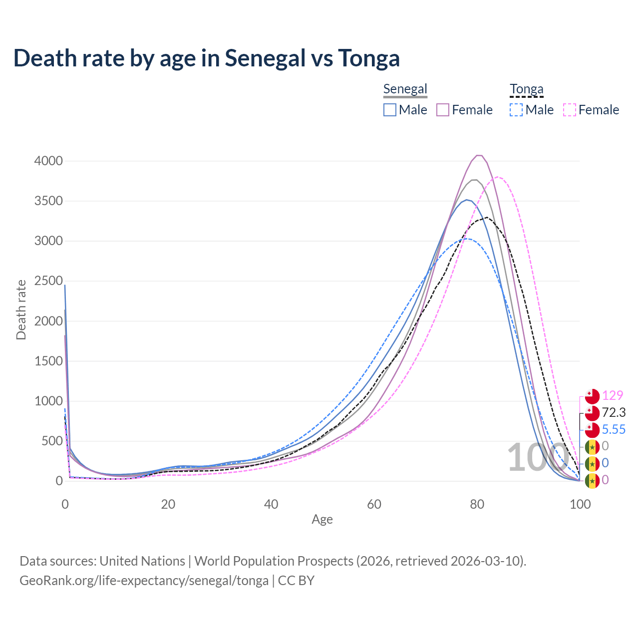 In Senegal, the most common age of death is 80, compared to 82 in Tonga. The median age of death is 75 in Senegal and 77 in Tonga, meaning only half of each cohort is expected to live past that age.