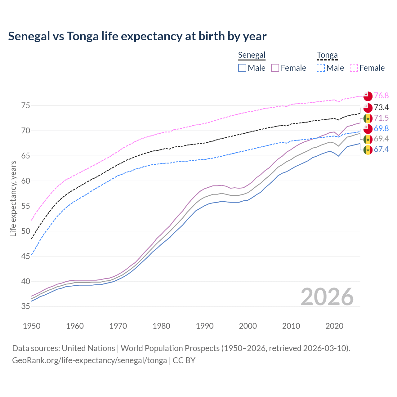 The average life expectancy at birth is 69.4 years in Senegal vs 73.4 in Tonga. Senegal is ranked 143/197 by life expectancy, and Tonga is 109/197. In Senegal, the life expectancy is 67.4 years for males and 71.5 years for females. In Tonga, it's 69.8 years for males and 76.8 years for females.