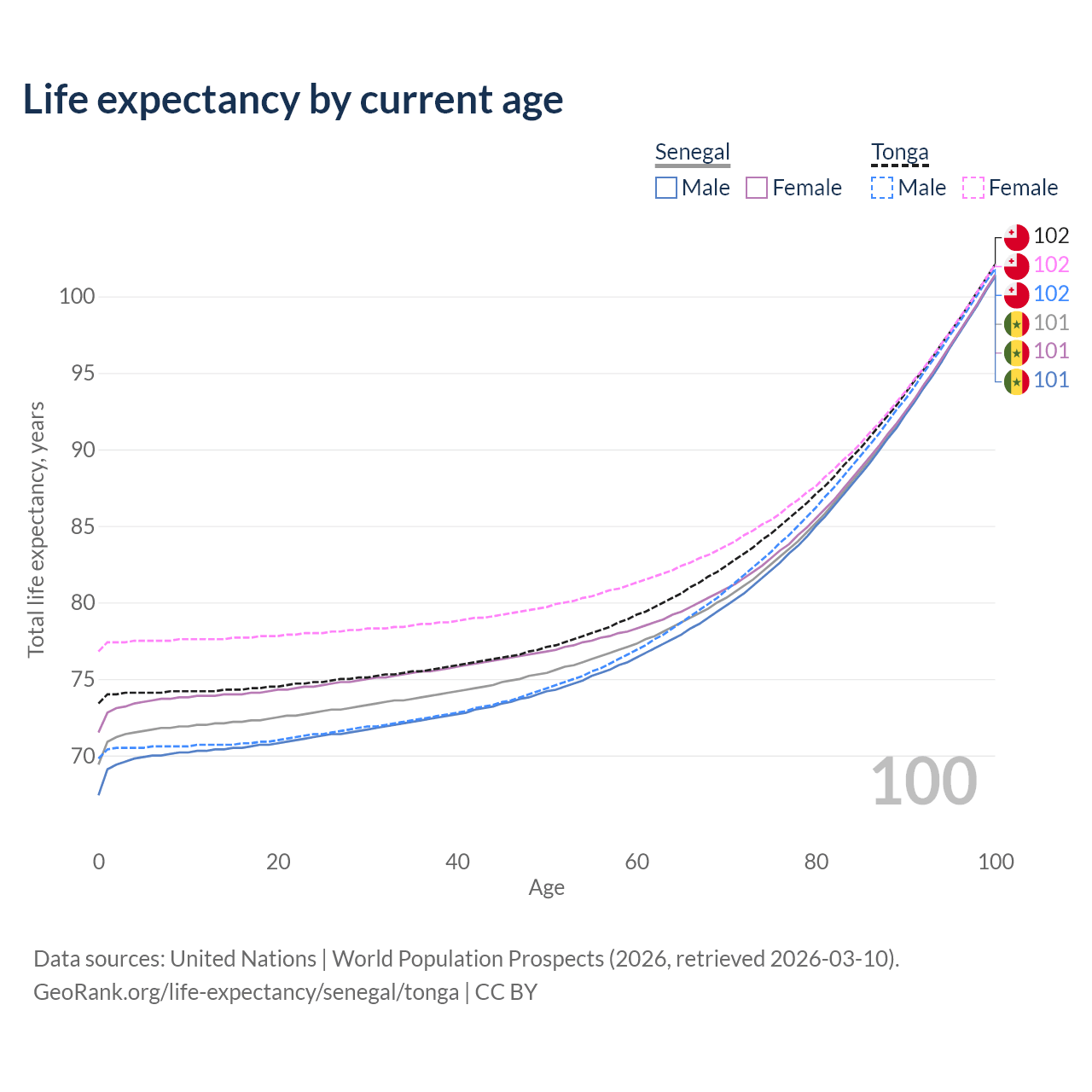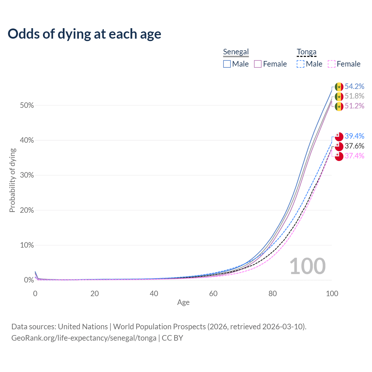 This life expectancy calculator shows the odds of living to 100, 95, 90, and below based on current age for both males and females in Senegal and Tonga, along with mean and median age of death. The calculations are based on the 2026 life tables (actuarial tables) from the UN World Population Prospects.