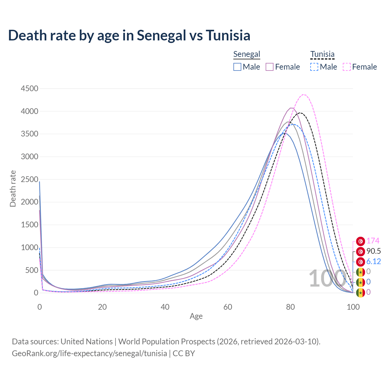 This life expectancy calculator shows the odds of living to 100, 95, 90, and below based on current age for both males and females in Senegal and Tunisia, along with mean and median age of death. The calculations are based on the 2026 life tables (actuarial tables) from the UN World Population Prospects.