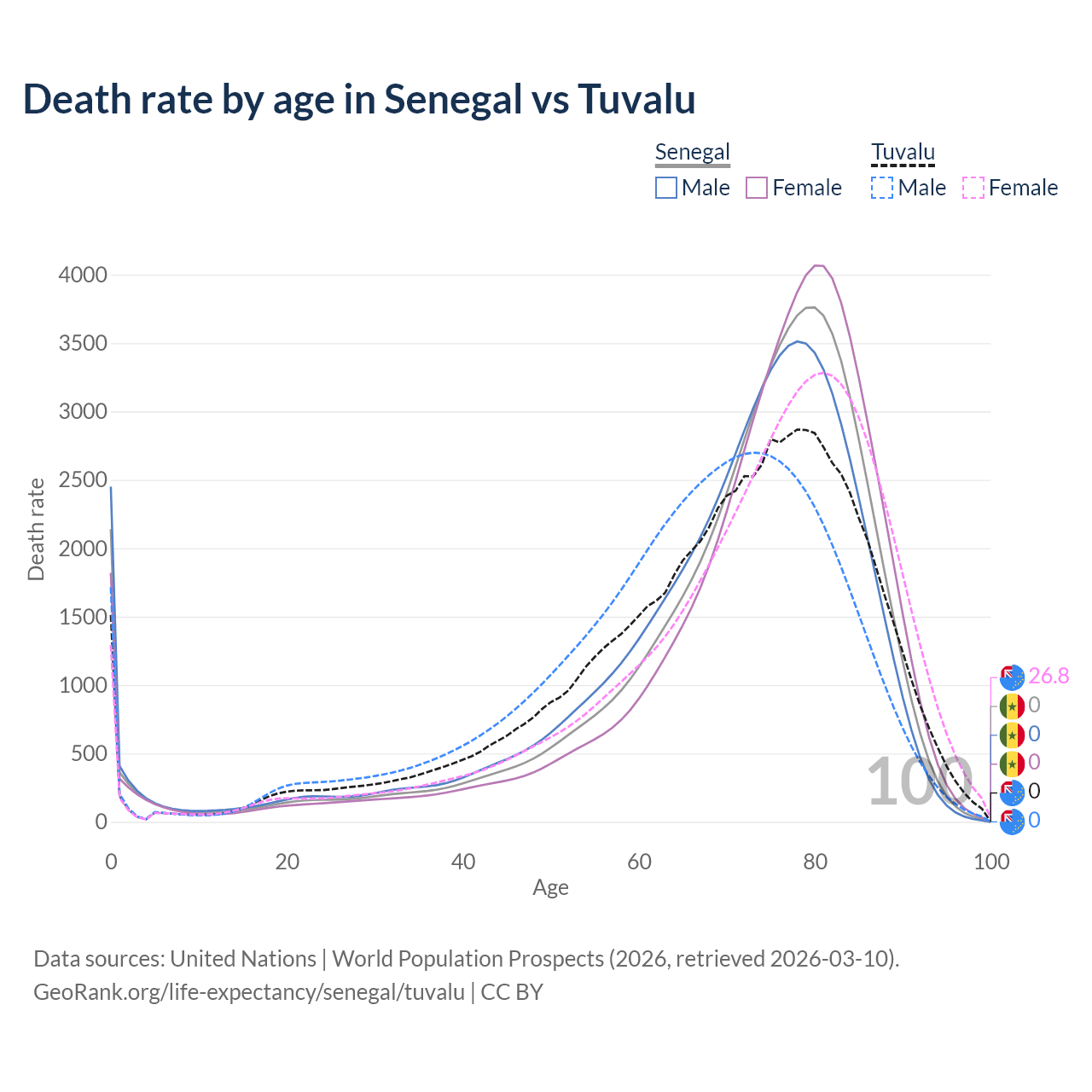 In Senegal, the most common age of death is 80, compared to 78 in Tuvalu. The median age of death is 75 in Senegal and 71.9 in Tuvalu, meaning only half of each cohort is expected to live past that age.