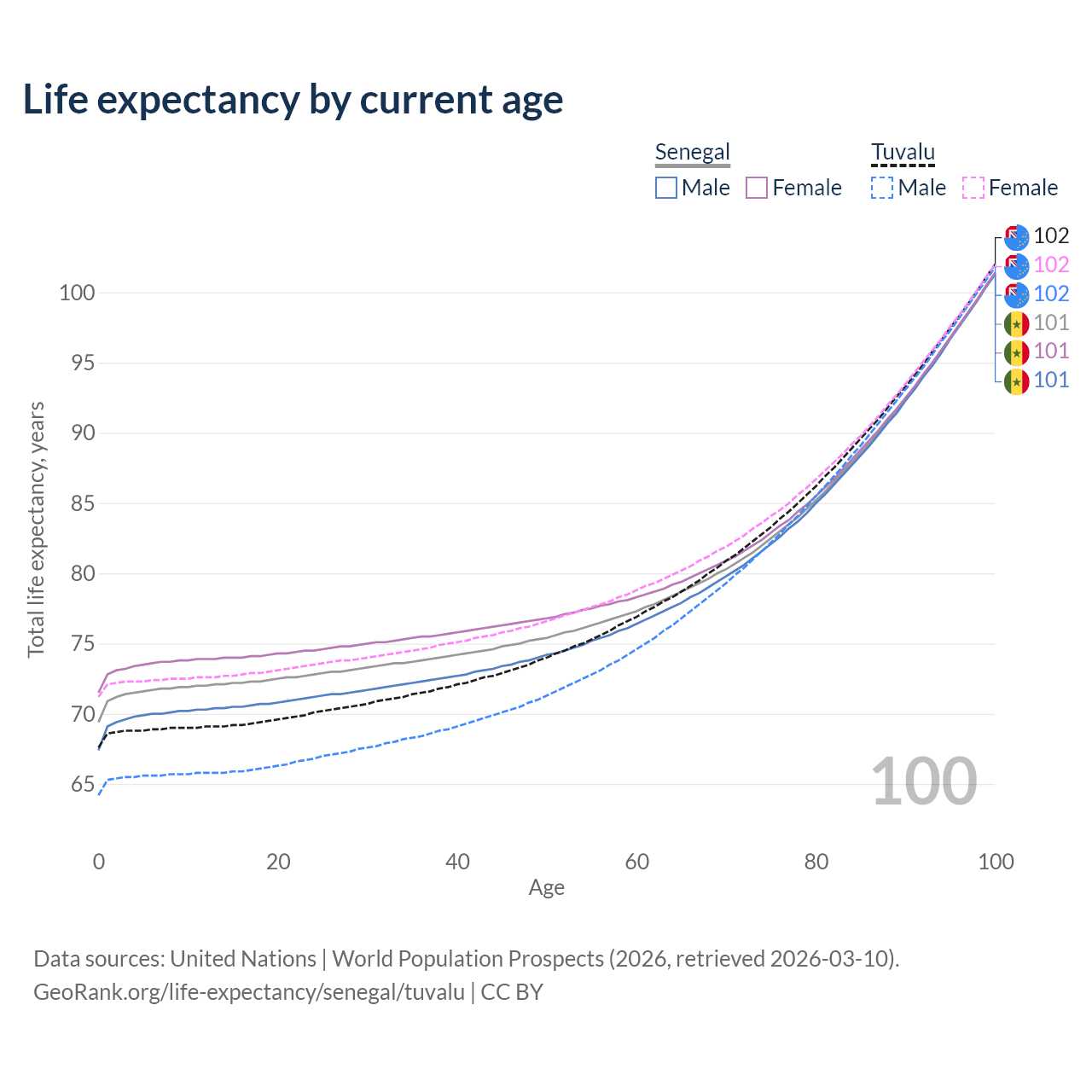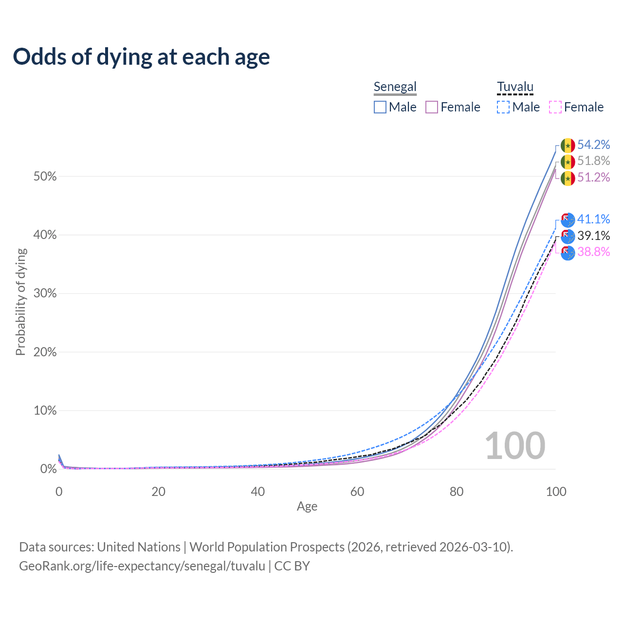 This life expectancy calculator shows the odds of living to 100, 95, 90, and below based on current age for both males and females in Senegal and Tuvalu, along with mean and median age of death. The calculations are based on the 2026 life tables (actuarial tables) from the UN World Population Prospects.