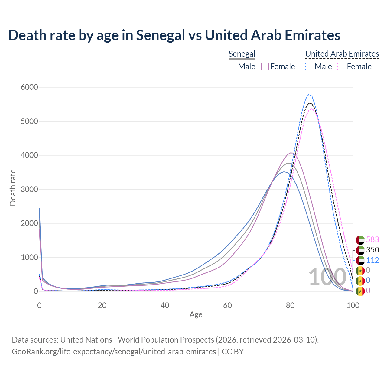 In Senegal, the most common age of death is 80, compared to 86 in the United Arab Emirates. The median age of death is 75 in Senegal and 85.6 in the United Arab Emirates, meaning only half of each cohort is expected to live past that age.