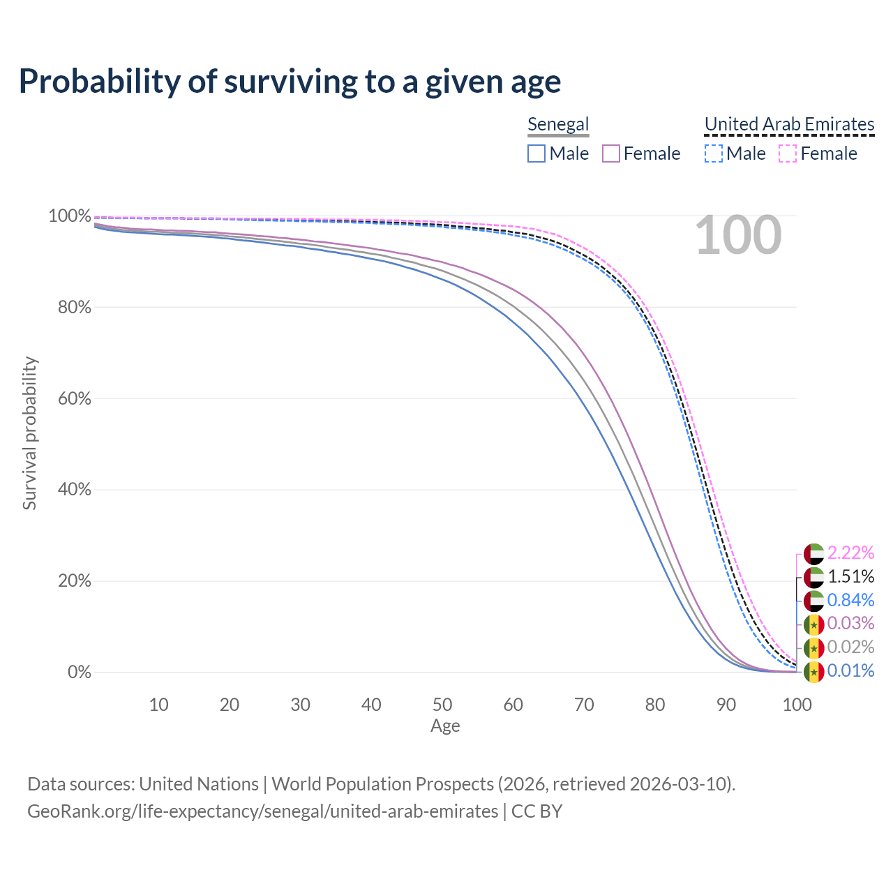 This life expectancy calculator shows the odds of living to 100, 95, 90, and below based on current age for both males and females in Senegal and the United Arab Emirates, along with mean and median age of death. The calculations are based on the 2026 life tables (actuarial tables) from the UN World Population Prospects.
