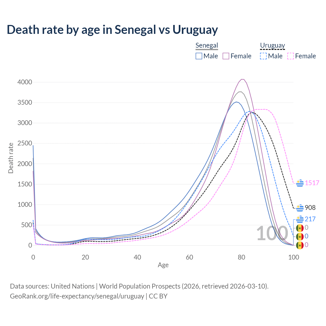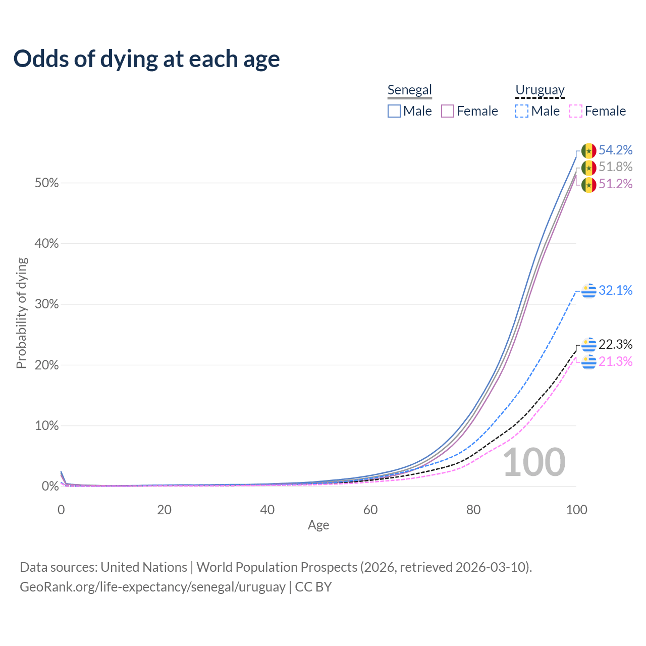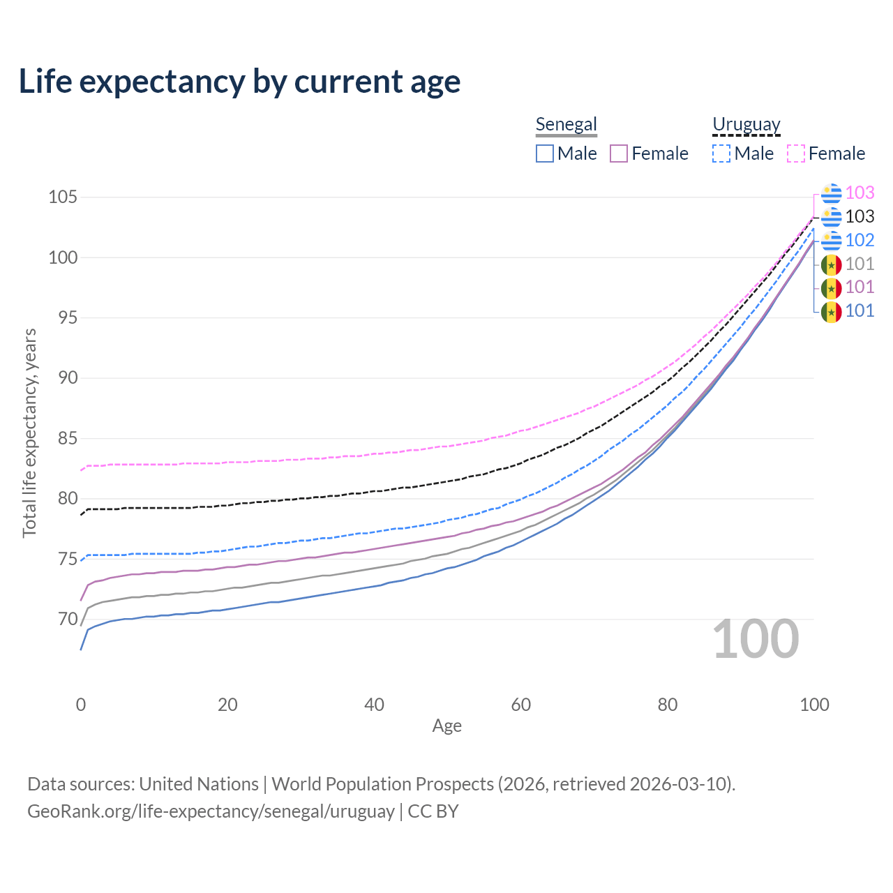 This life expectancy calculator shows the odds of living to 100, 95, 90, and below based on current age for both males and females in Senegal and Uruguay, along with mean and median age of death. The calculations are based on the 2026 life tables (actuarial tables) from the UN World Population Prospects.
