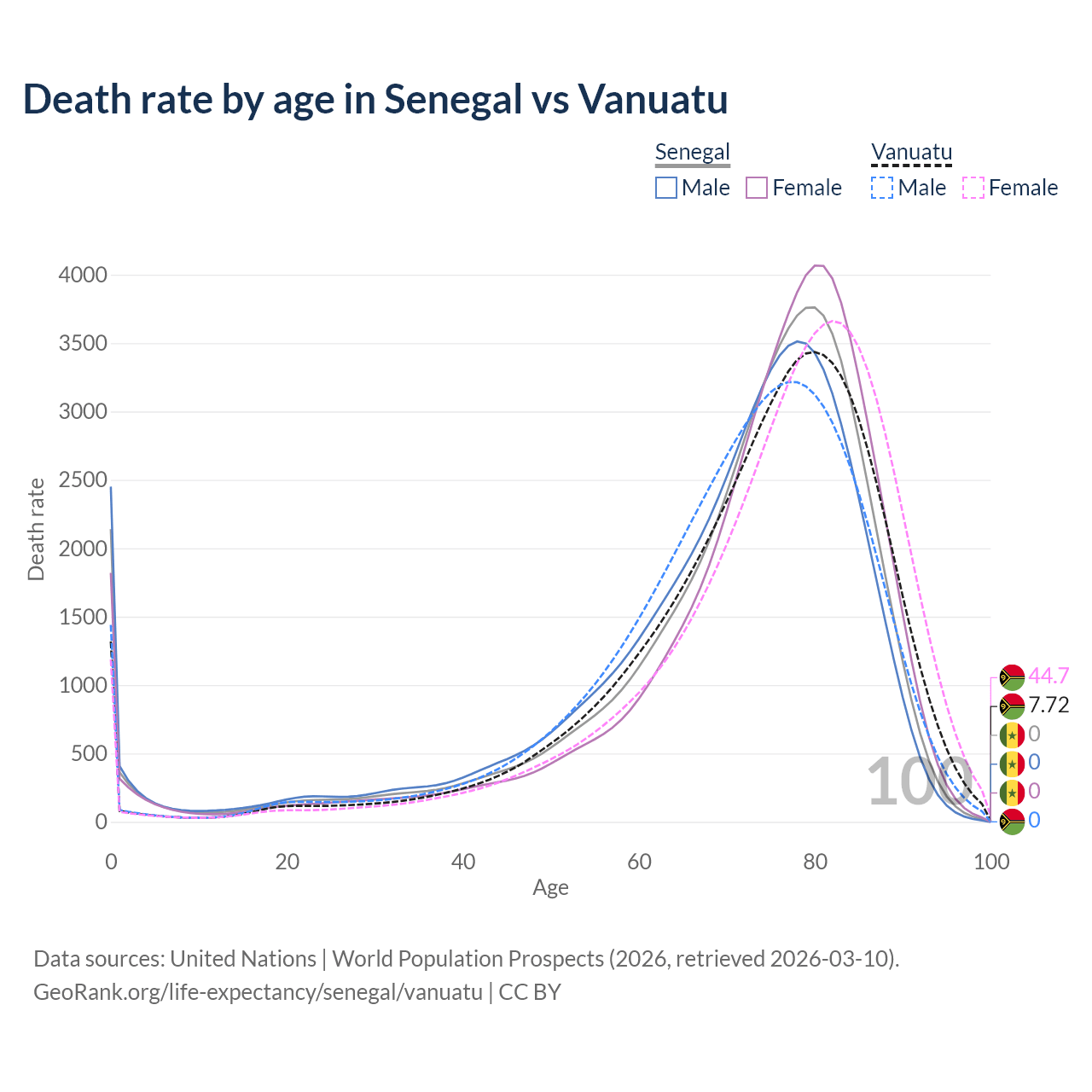 In Senegal, the most common age of death is 80, compared to 80 in Vanuatu. The median age of death is 75 in Senegal and 75.9 in Vanuatu, meaning only half of each cohort is expected to live past that age.
