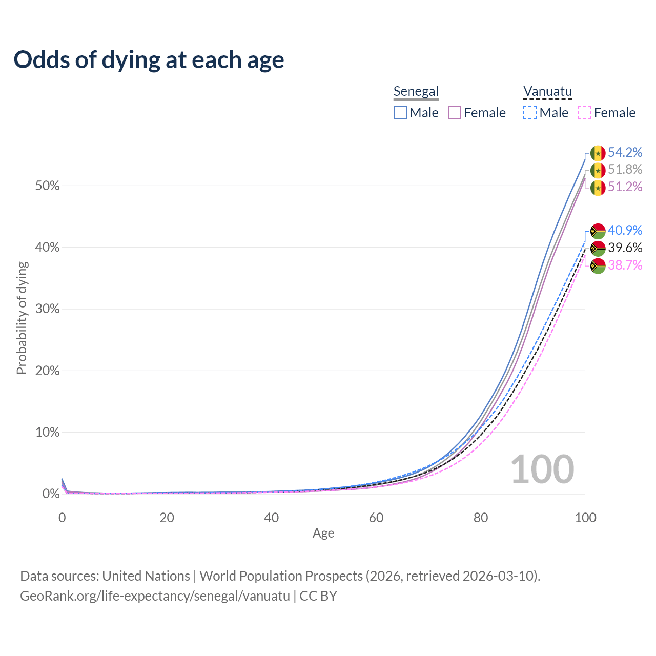 This life expectancy calculator shows the odds of living to 100, 95, 90, and below based on current age for both males and females in Senegal and Vanuatu, along with mean and median age of death. The calculations are based on the 2026 life tables (actuarial tables) from the UN World Population Prospects.