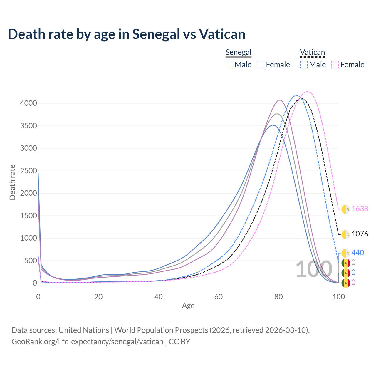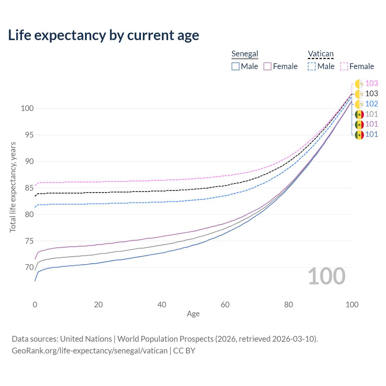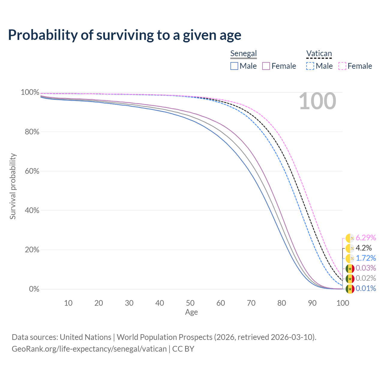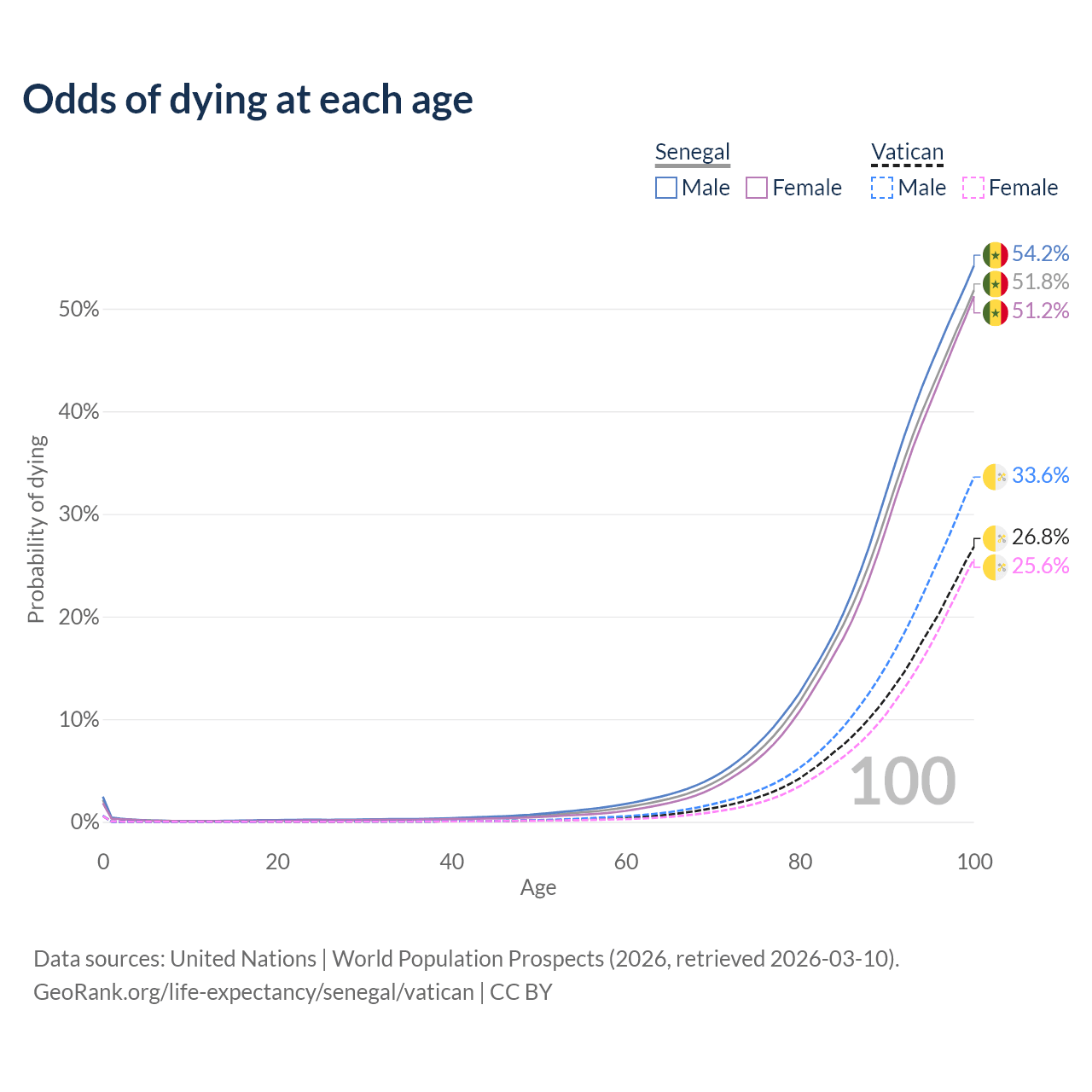 This life expectancy calculator shows the odds of living to 100, 95, 90, and below based on current age for both males and females in Senegal and the Vatican, along with mean and median age of death. The calculations are based on the 2026 life tables (actuarial tables) from the UN World Population Prospects.