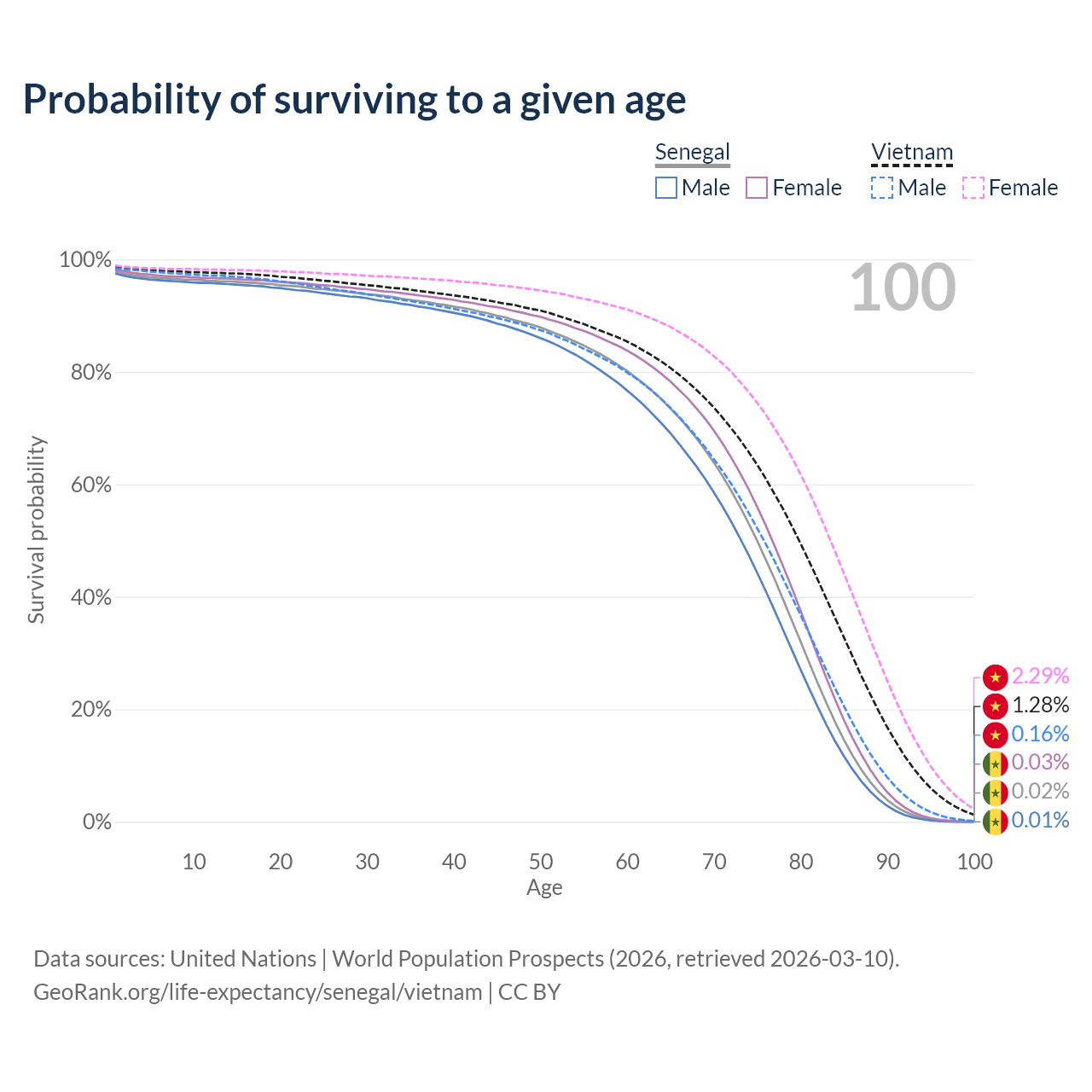 This life expectancy calculator shows the odds of living to 100, 95, 90, and below based on current age for both males and females in Senegal and Vietnam, along with mean and median age of death. The calculations are based on the 2026 life tables (actuarial tables) from the UN World Population Prospects.