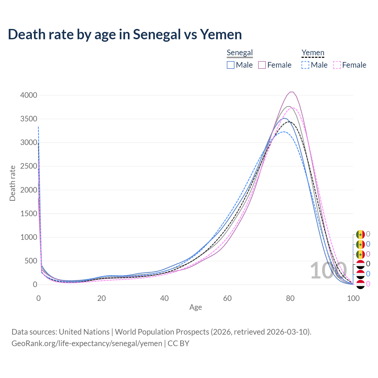 In Senegal, the most common age of death is 80, compared to 80 in Yemen. The median age of death is 75 in Senegal and 74.9 in Yemen, meaning only half of each cohort is expected to live past that age.