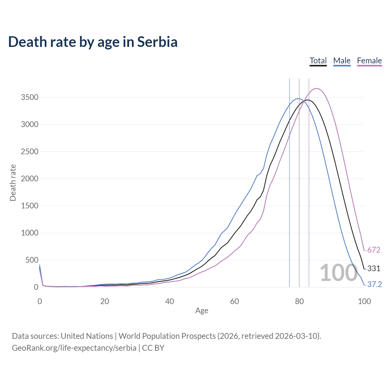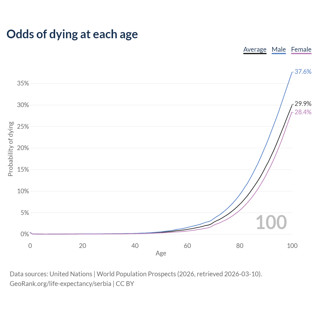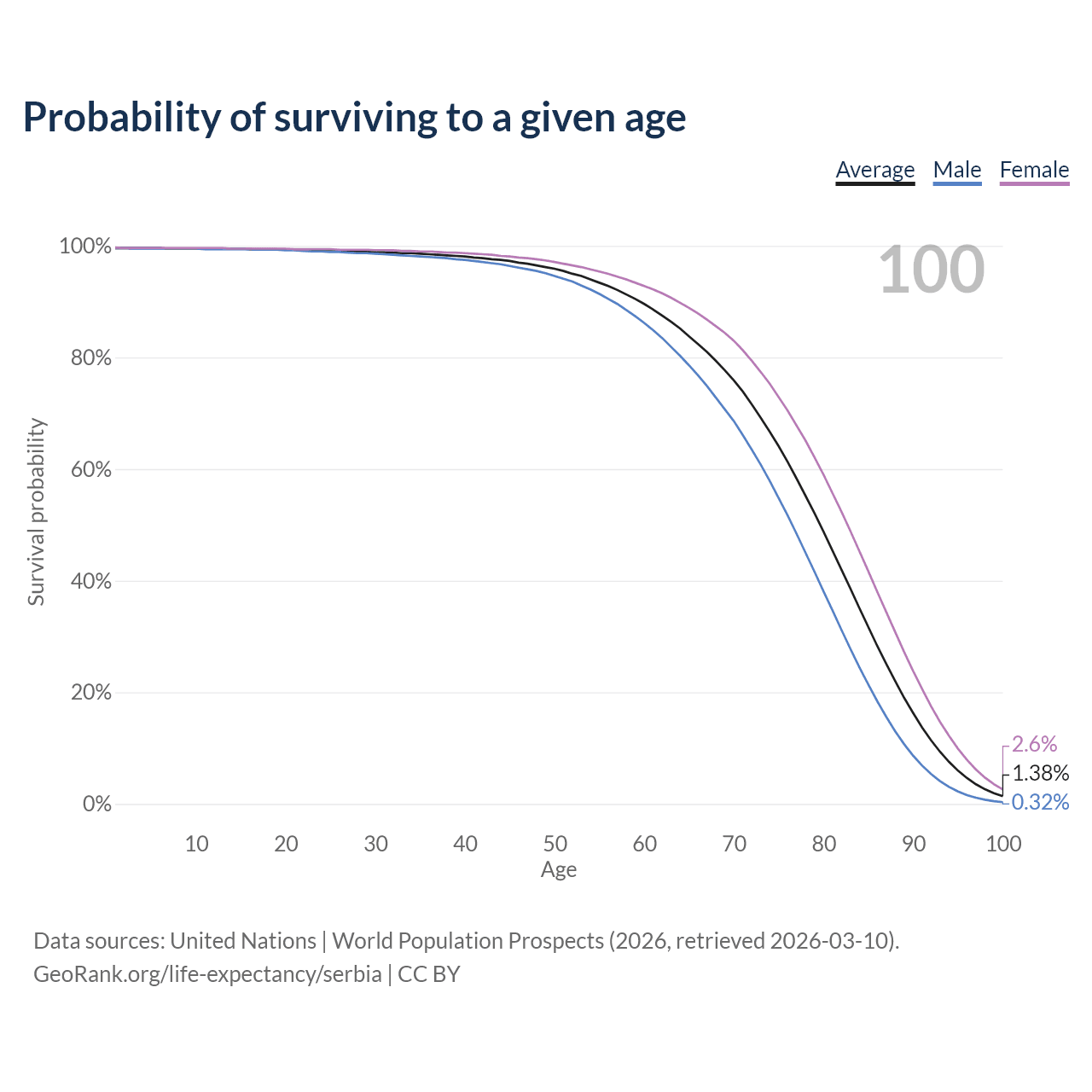This life expectancy calculator shows the odds of living to 100, 95, 90, and below based on current age for both males and females in Serbia, along with mean and median age of death. The calculations are based on the 2026 life tables (actuarial tables) from the UN World Population Prospects.