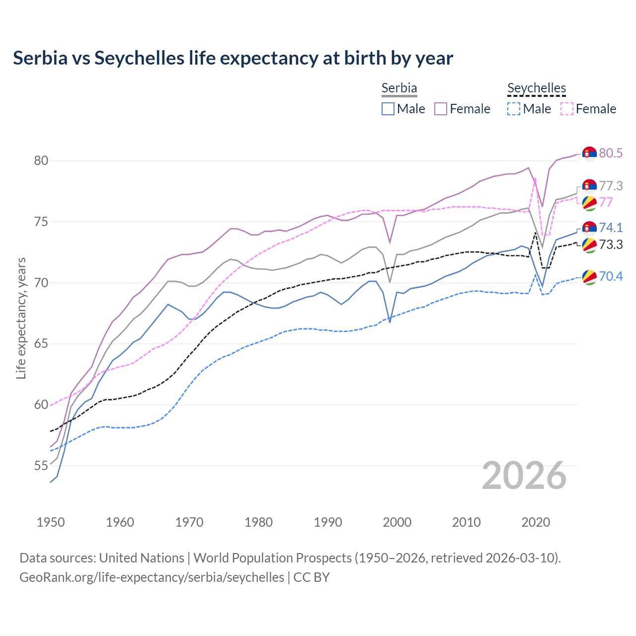 The average life expectancy at birth is 77.3 years in Serbia vs 73.3 in the Seychelles. Serbia is ranked 72/197 by life expectancy, and the Seychelles is 111/197. In Serbia, the life expectancy is 74.1 years for males and 80.5 years for females. In the Seychelles, it's 70.4 years for males and 77 years for females.