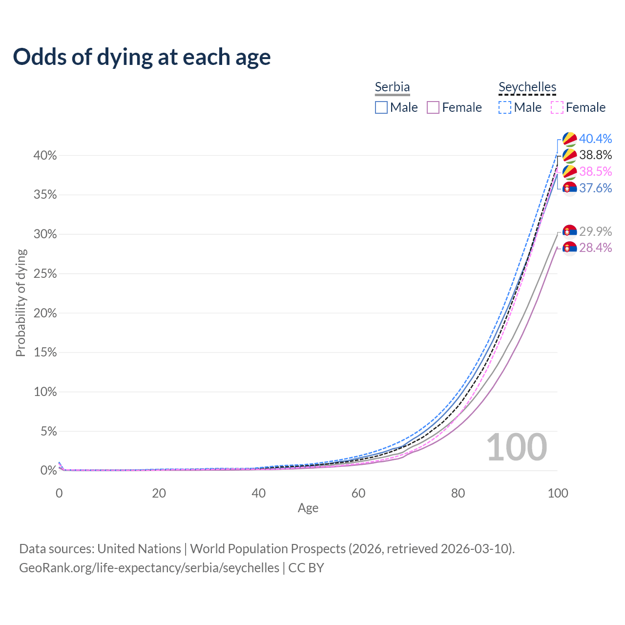 This life expectancy calculator shows the odds of living to 100, 95, 90, and below based on current age for both males and females in Serbia and the Seychelles, along with mean and median age of death. The calculations are based on the 2026 life tables (actuarial tables) from the UN World Population Prospects.