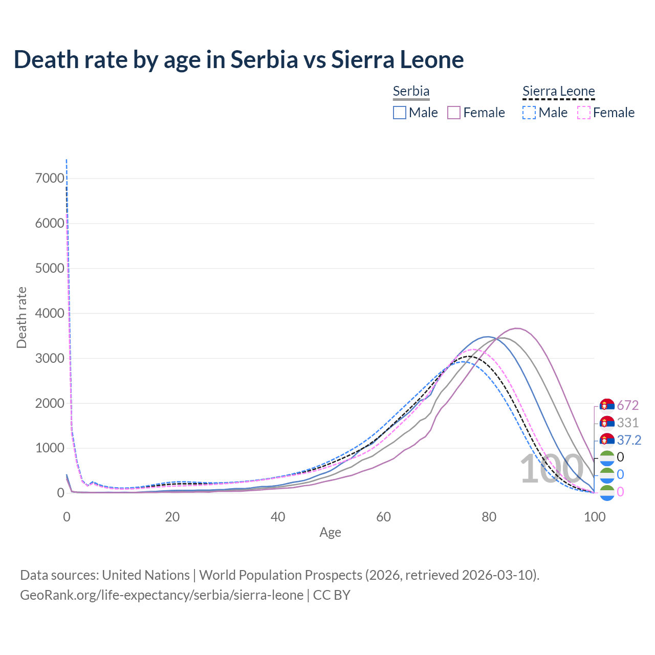 In Serbia, the most common age of death is 83, compared to 0 in Sierra Leone. The median age of death is 79.6 in Serbia and 70.8 in Sierra Leone, meaning only half of each cohort is expected to live past that age.