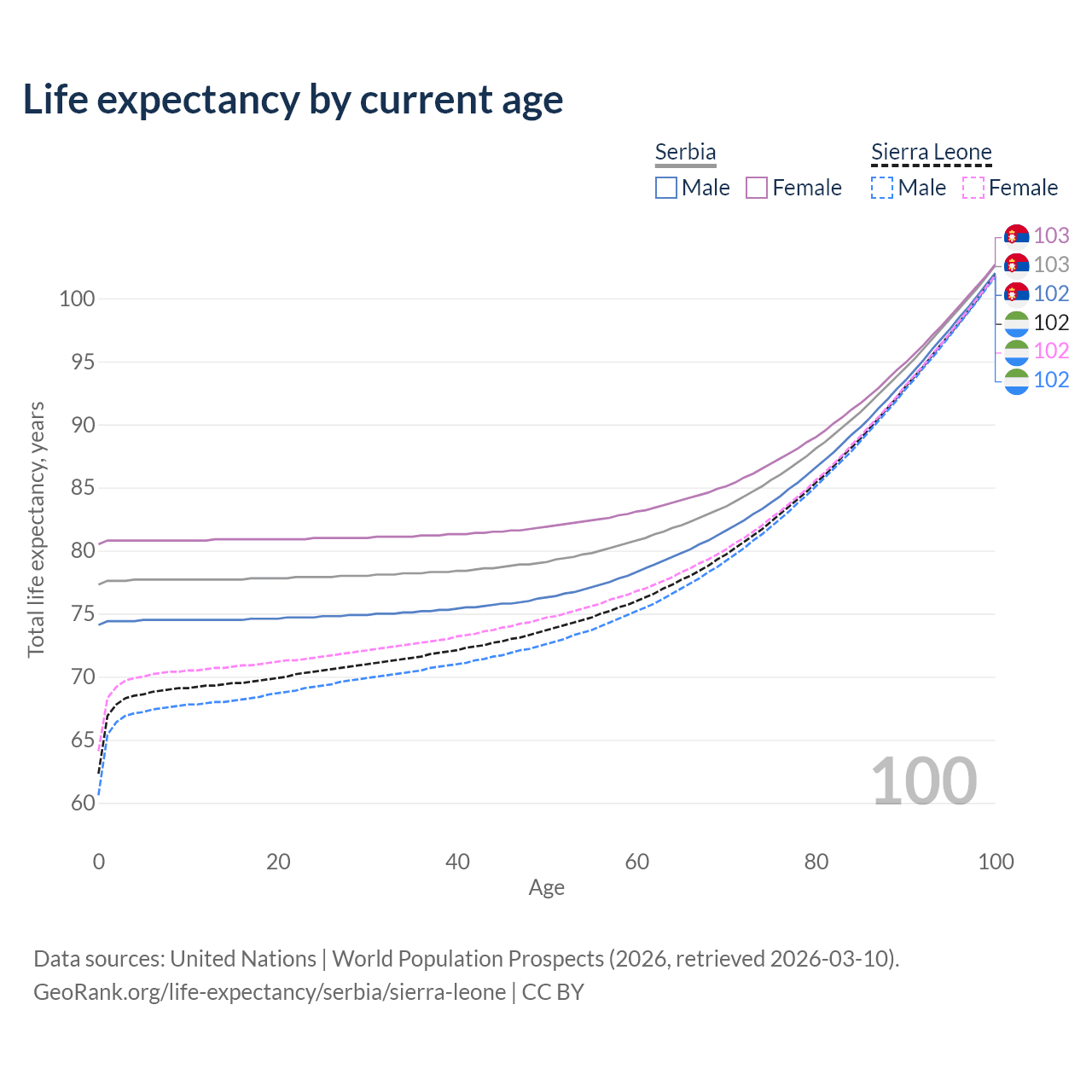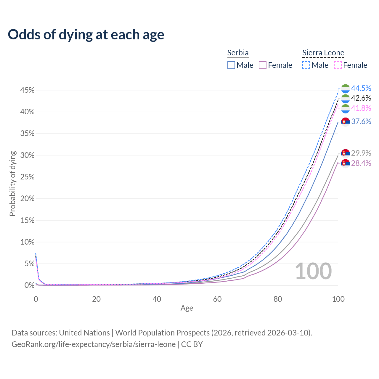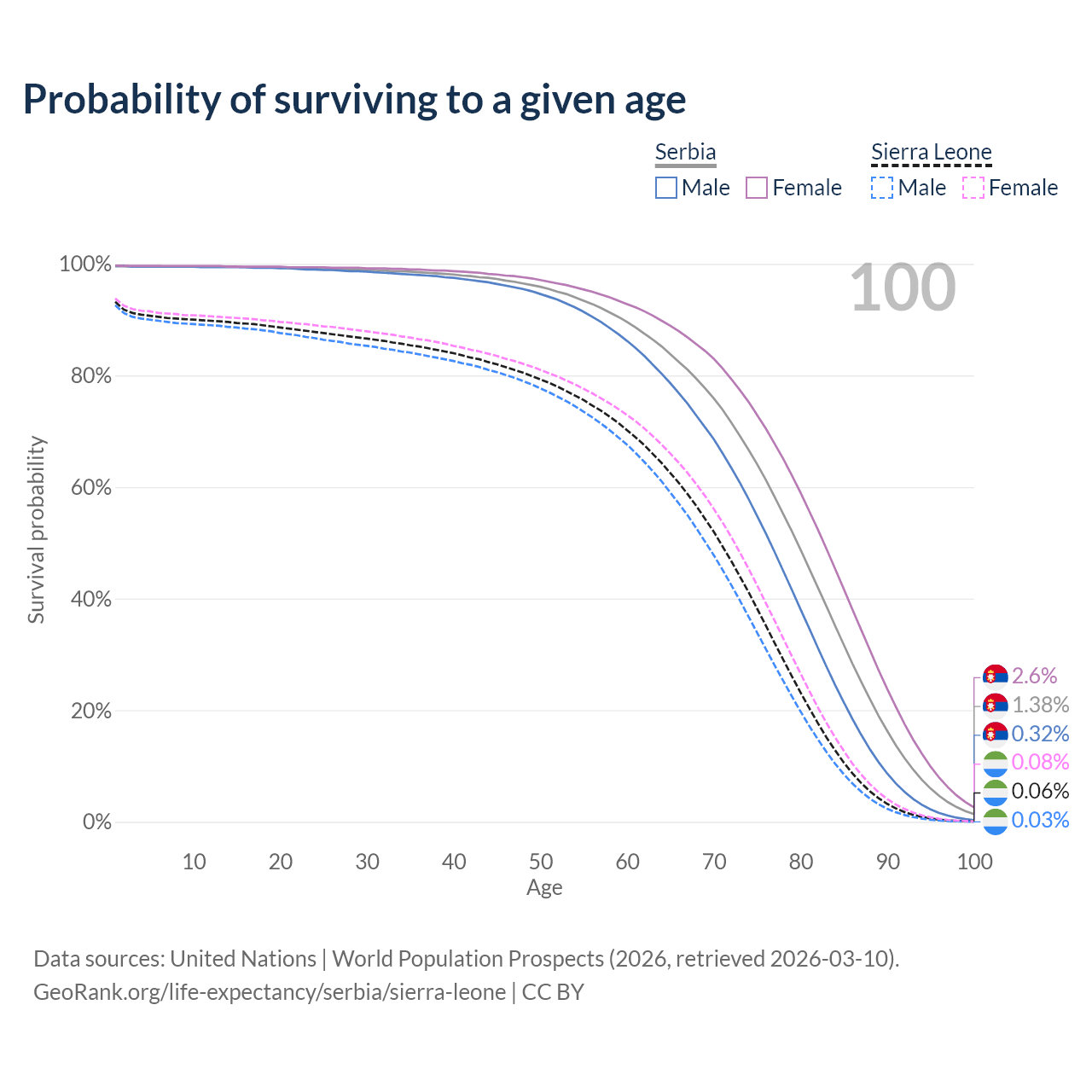 This life expectancy calculator shows the odds of living to 100, 95, 90, and below based on current age for both males and females in Serbia and Sierra Leone, along with mean and median age of death. The calculations are based on the 2026 life tables (actuarial tables) from the UN World Population Prospects.