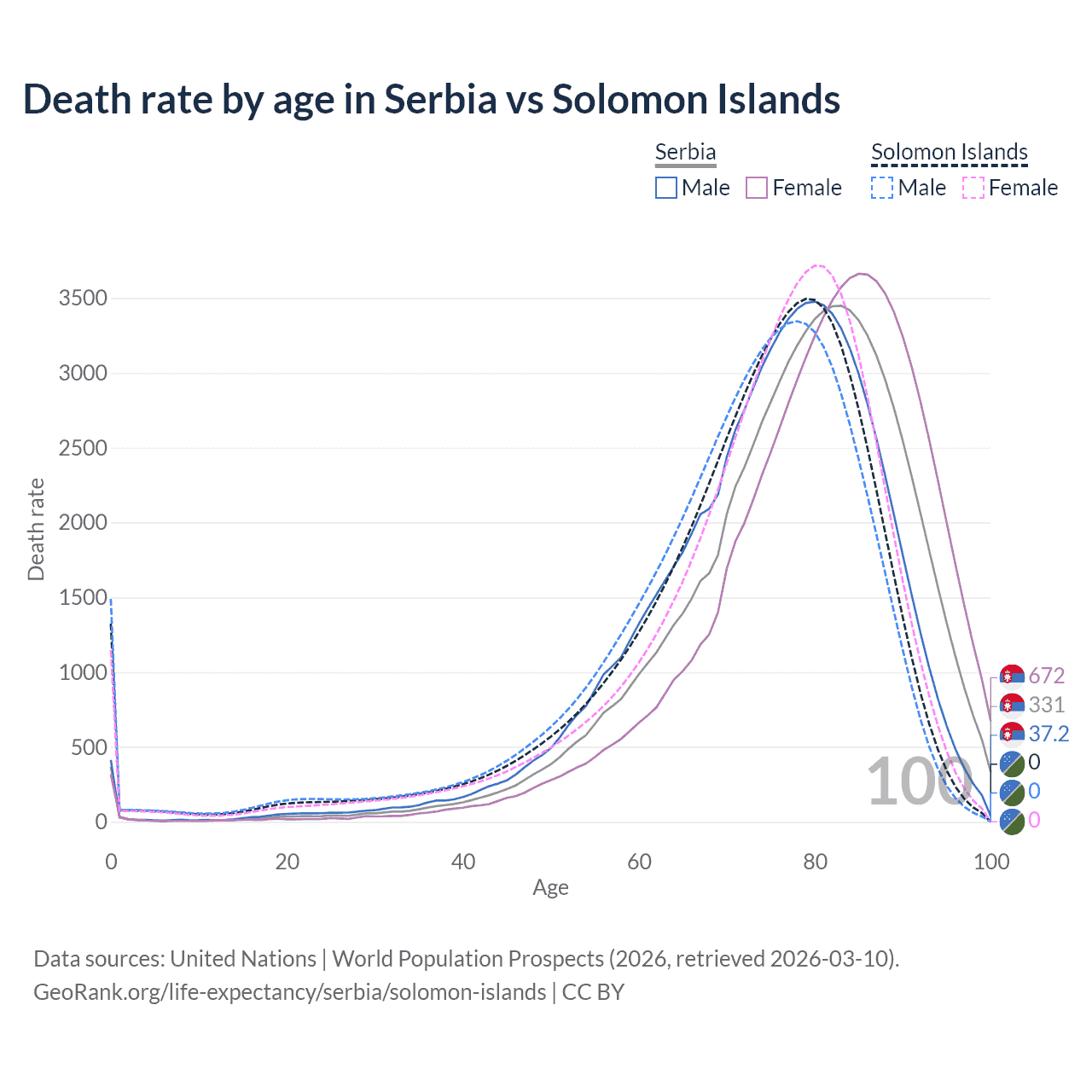 In Serbia, the most common age of death is 83, compared to 79 in the Solomon Islands. The median age of death is 79.6 in Serbia and 74.9 in the Solomon Islands, meaning only half of each cohort is expected to live past that age.