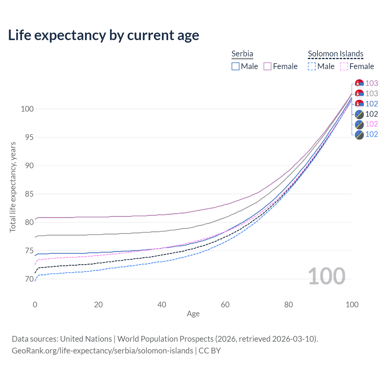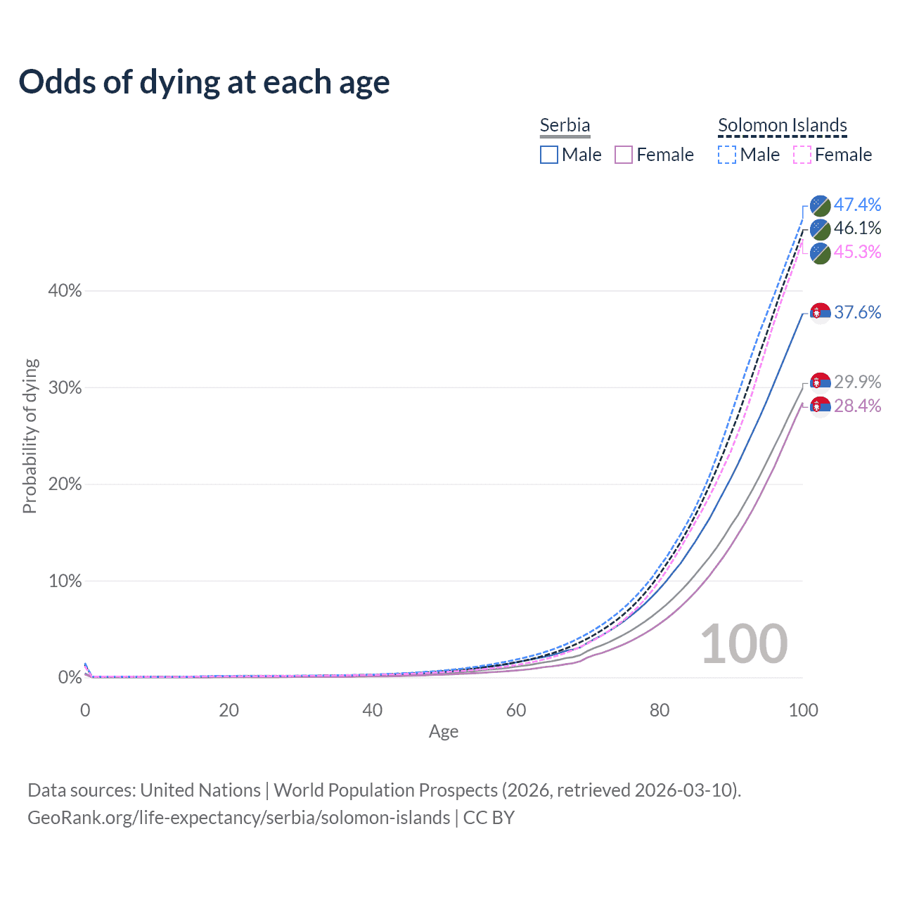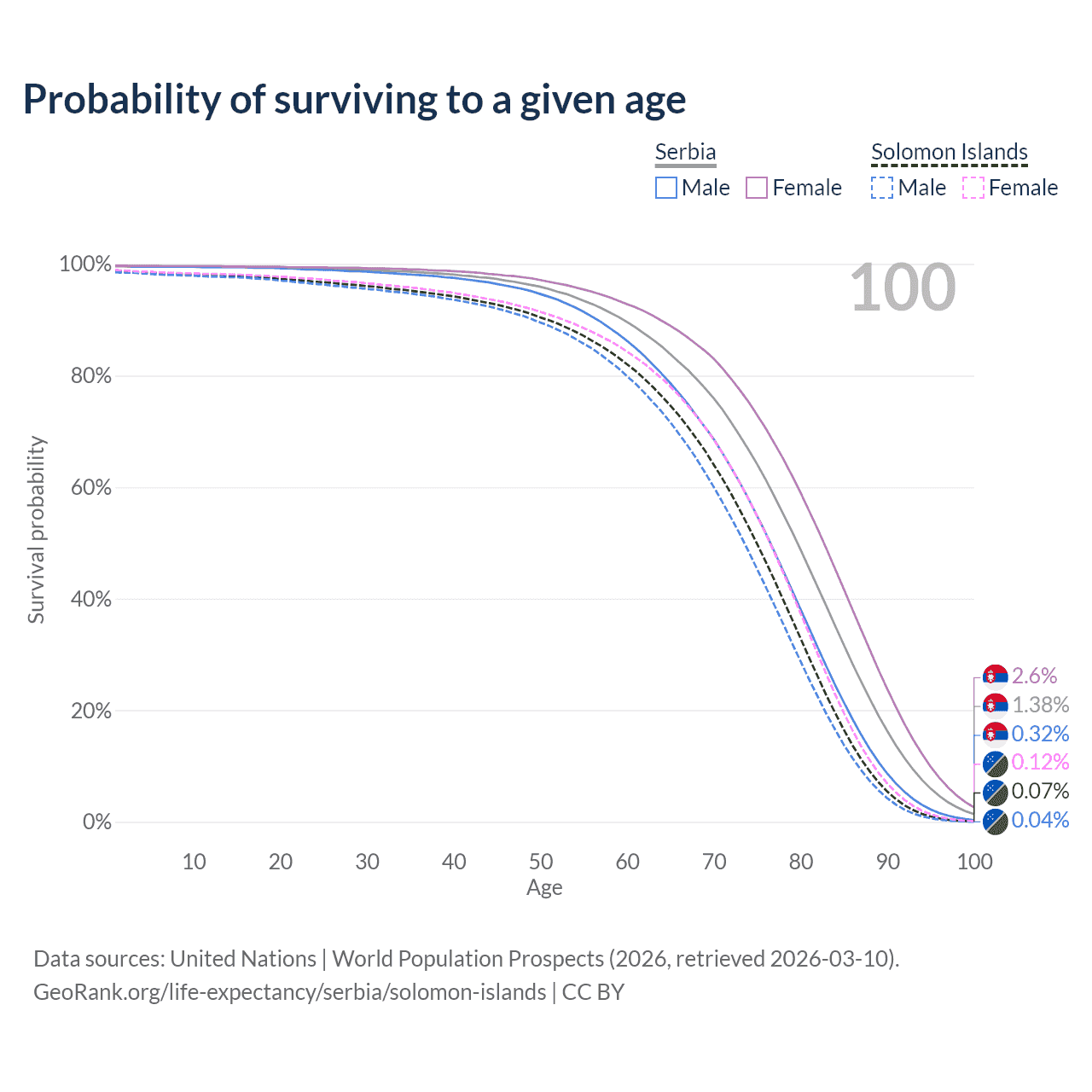 This life expectancy calculator shows the odds of living to 100, 95, 90, and below based on current age for both males and females in Serbia and the Solomon Islands, along with mean and median age of death. The calculations are based on the 2026 life tables (actuarial tables) from the UN World Population Prospects.