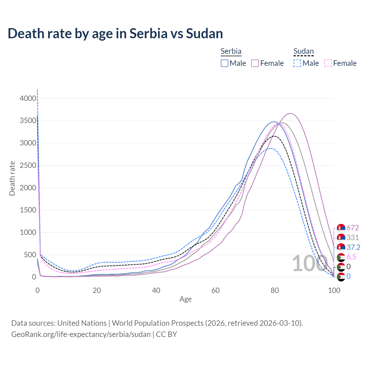 This life expectancy calculator shows the odds of living to 100, 95, 90, and below based on current age for both males and females in Serbia and Sudan, along with mean and median age of death. The calculations are based on the 2026 life tables (actuarial tables) from the UN World Population Prospects.