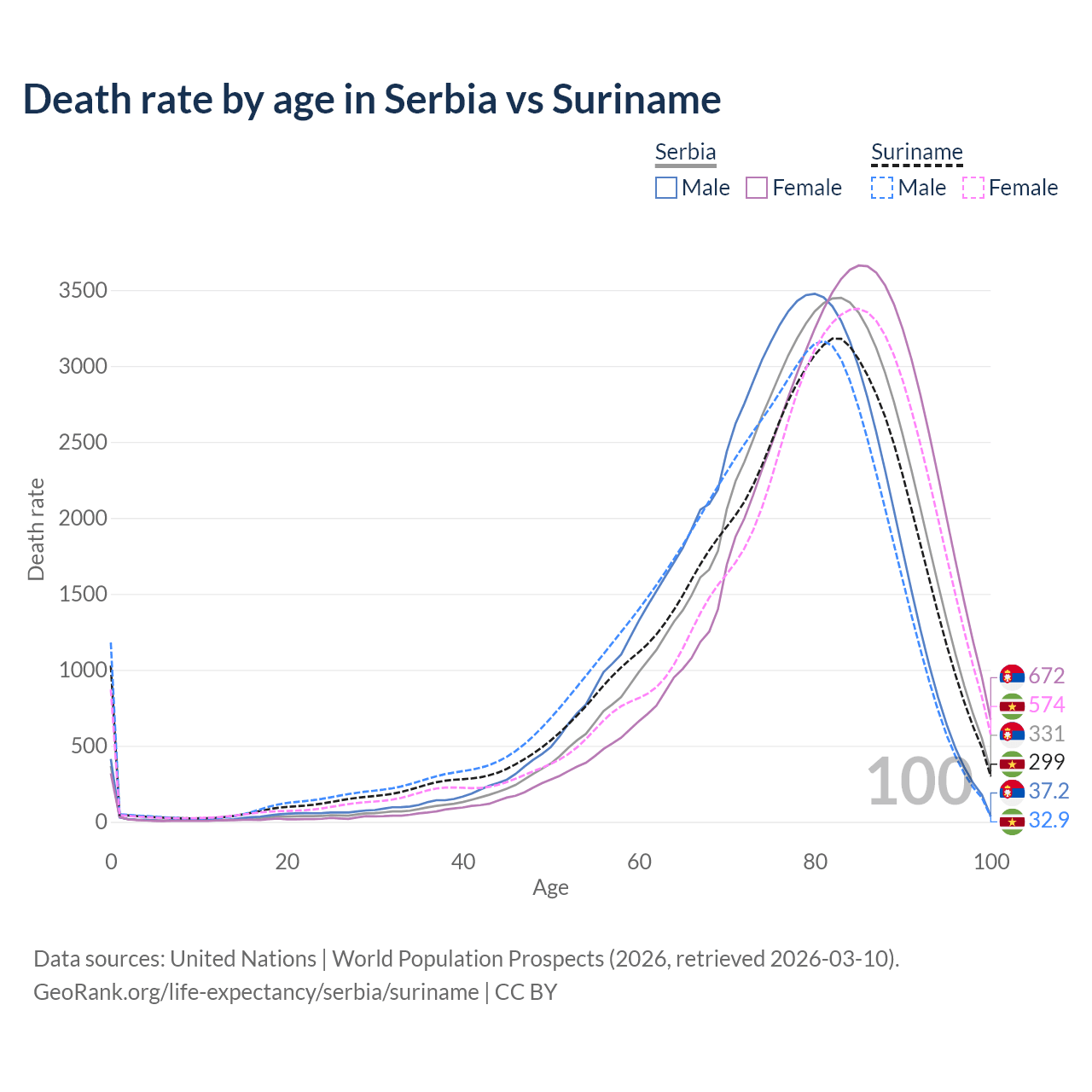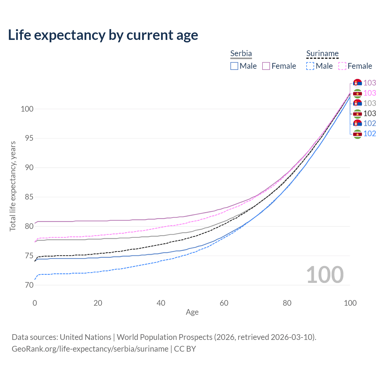 This life expectancy calculator shows the odds of living to 100, 95, 90, and below based on current age for both males and females in Serbia and Suriname, along with mean and median age of death. The calculations are based on the 2026 life tables (actuarial tables) from the UN World Population Prospects.