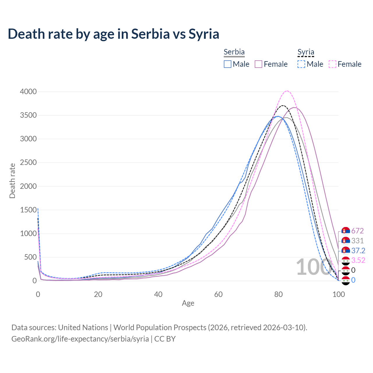 This life expectancy calculator shows the odds of living to 100, 95, 90, and below based on current age for both males and females in Serbia and Syria, along with mean and median age of death. The calculations are based on the 2026 life tables (actuarial tables) from the UN World Population Prospects.
