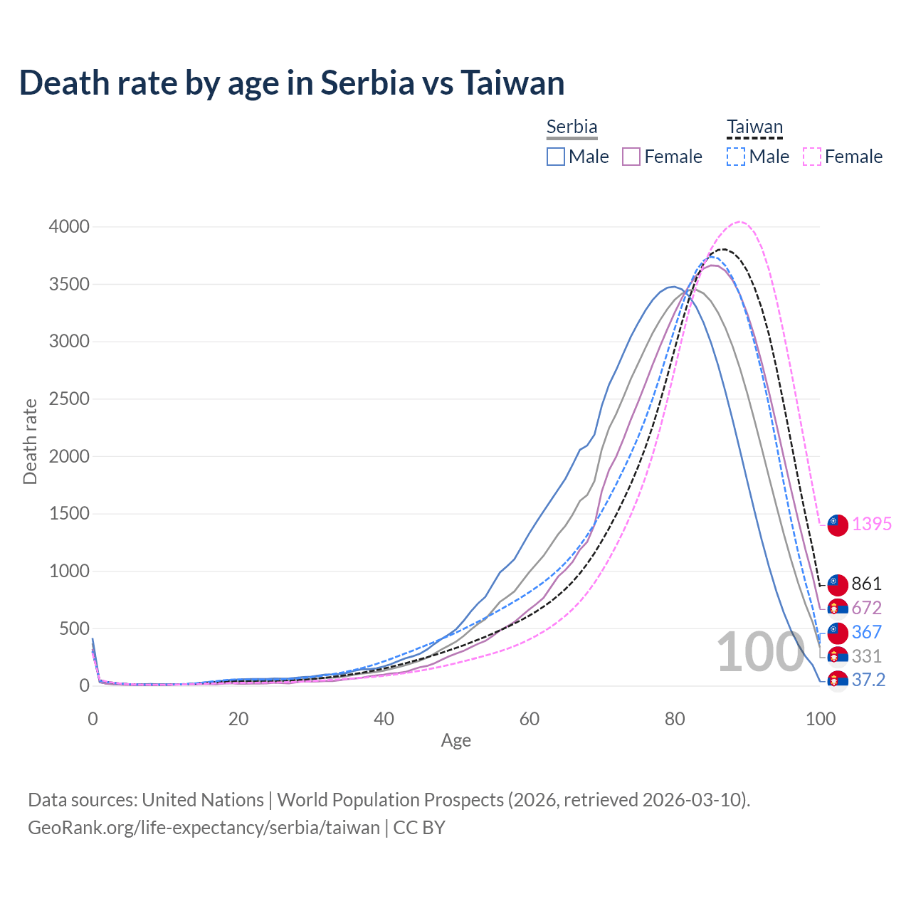 This life expectancy calculator shows the odds of living to 100, 95, 90, and below based on current age for both males and females in Serbia and Taiwan, along with mean and median age of death. The calculations are based on the 2026 life tables (actuarial tables) from the UN World Population Prospects.