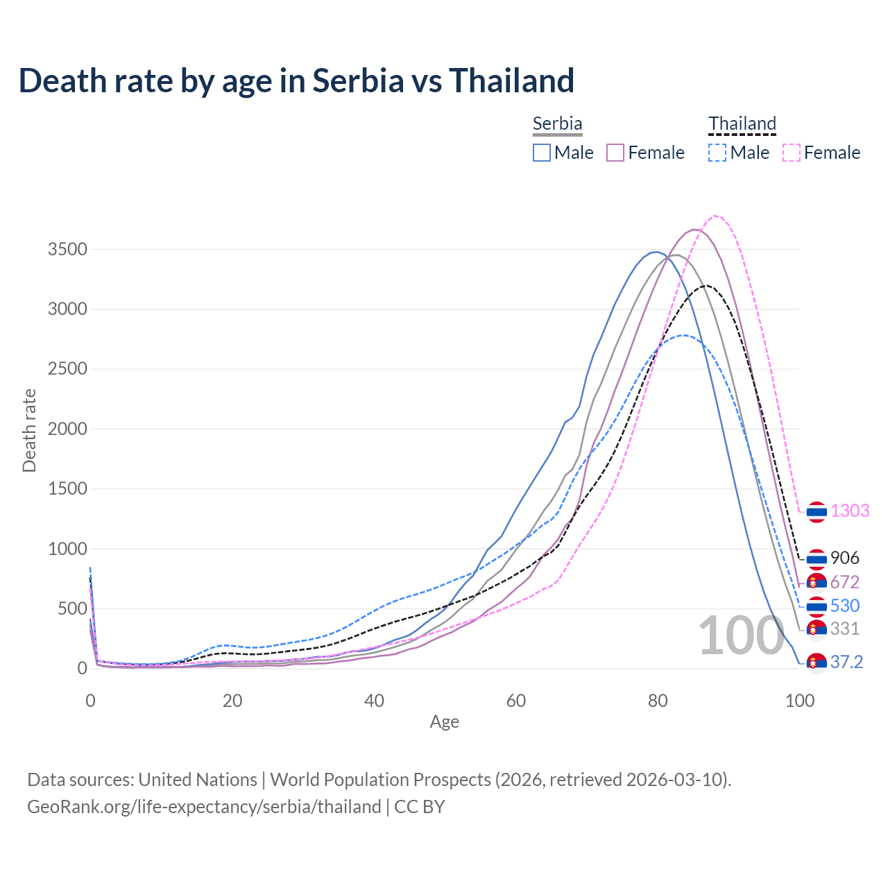 This life expectancy calculator shows the odds of living to 100, 95, 90, and below based on current age for both males and females in Serbia and Thailand, along with mean and median age of death. The calculations are based on the 2026 life tables (actuarial tables) from the UN World Population Prospects.