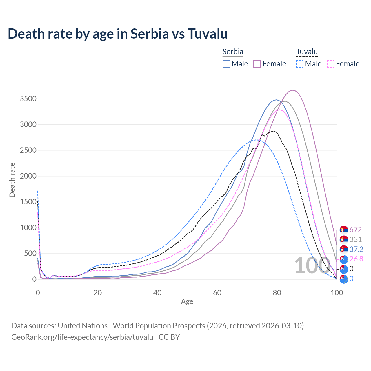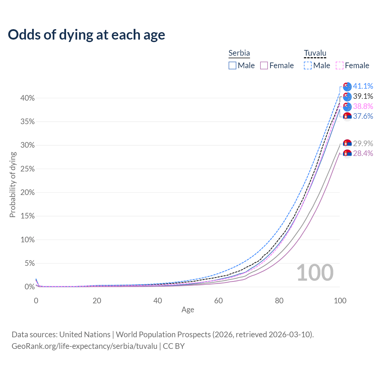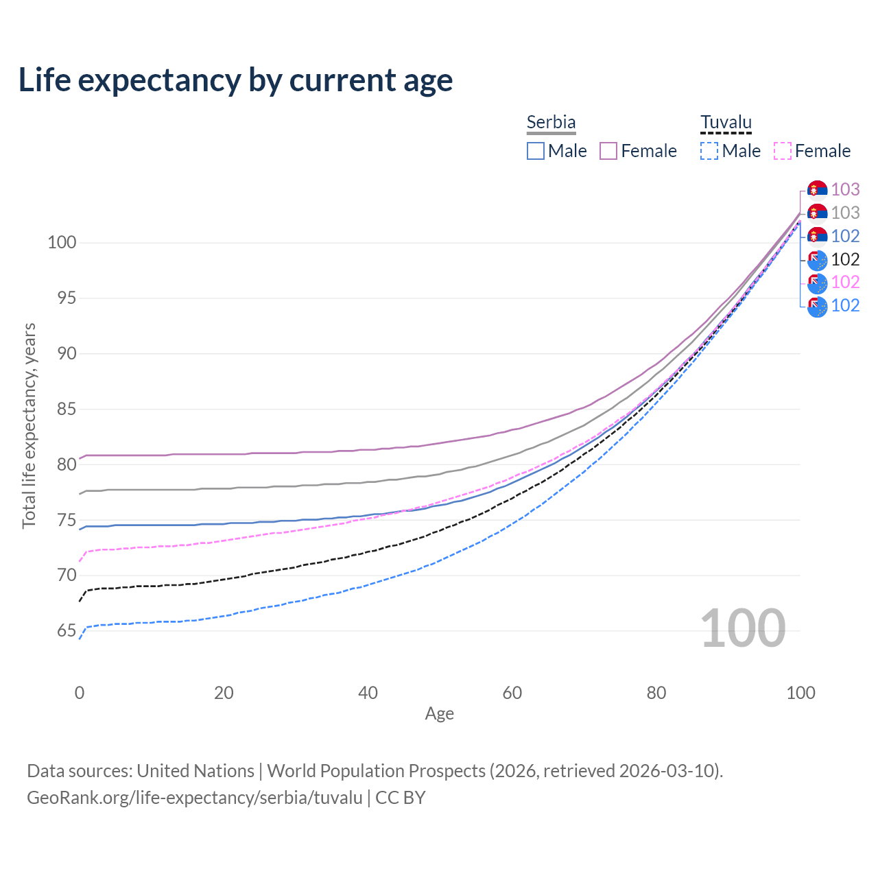 This life expectancy calculator shows the odds of living to 100, 95, 90, and below based on current age for both males and females in Serbia and Tuvalu, along with mean and median age of death. The calculations are based on the 2026 life tables (actuarial tables) from the UN World Population Prospects.