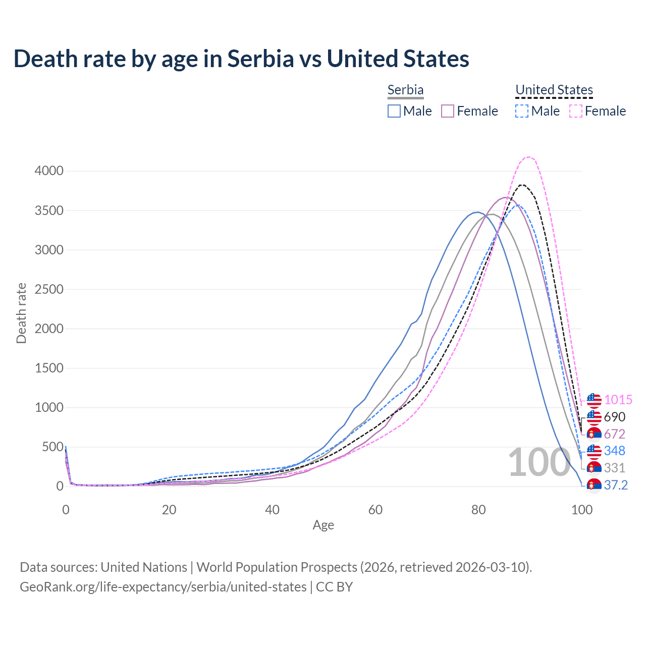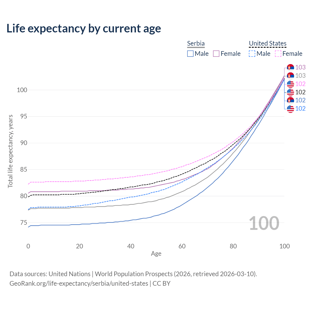 This life expectancy calculator shows the odds of living to 100, 95, 90, and below based on current age for both males and females in Serbia and the United States, along with mean and median age of death. The calculations are based on the 2026 life tables (actuarial tables) from the UN World Population Prospects.
