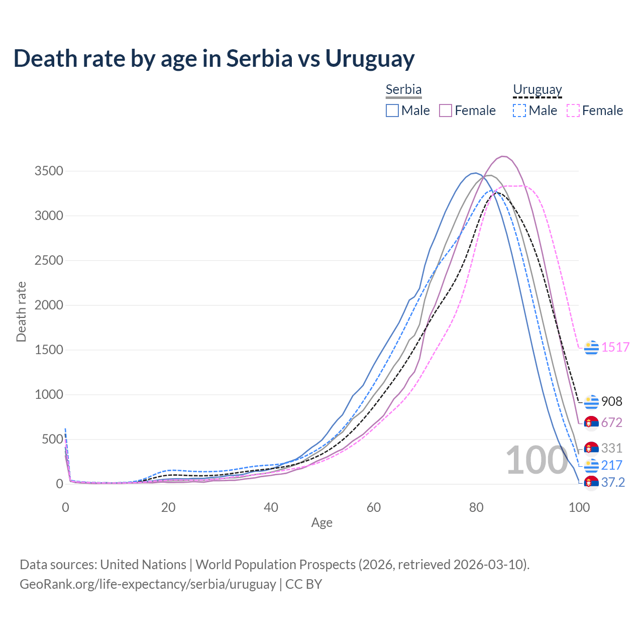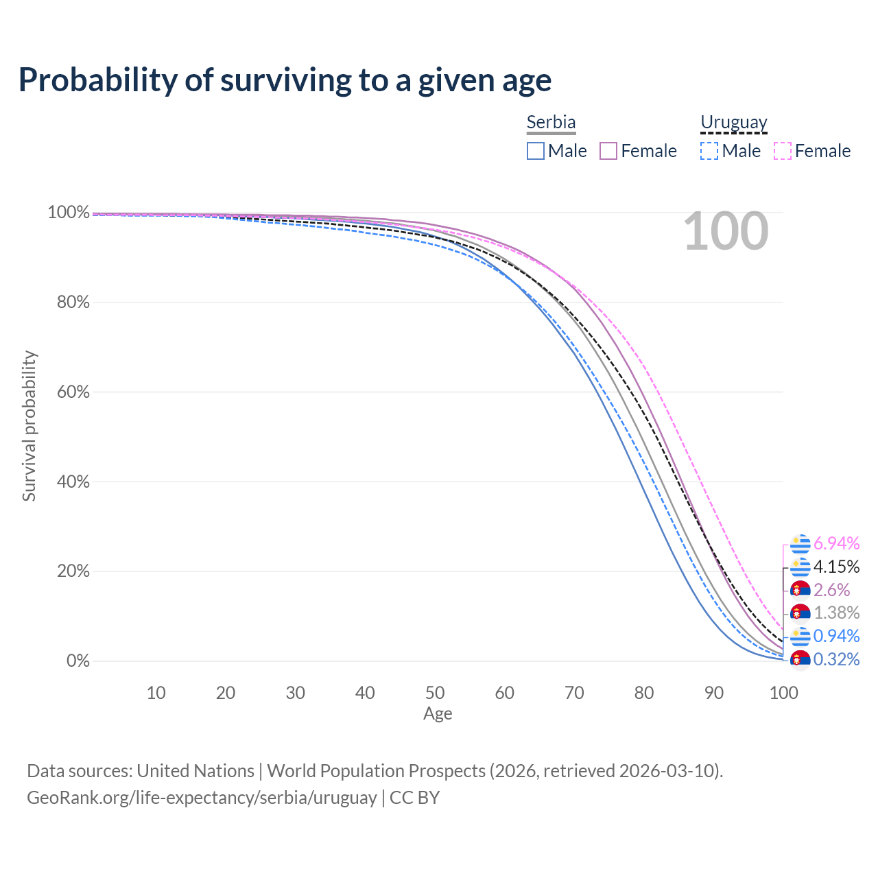 This life expectancy calculator shows the odds of living to 100, 95, 90, and below based on current age for both males and females in Serbia and Uruguay, along with mean and median age of death. The calculations are based on the 2026 life tables (actuarial tables) from the UN World Population Prospects.