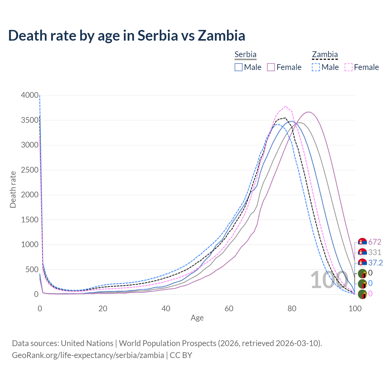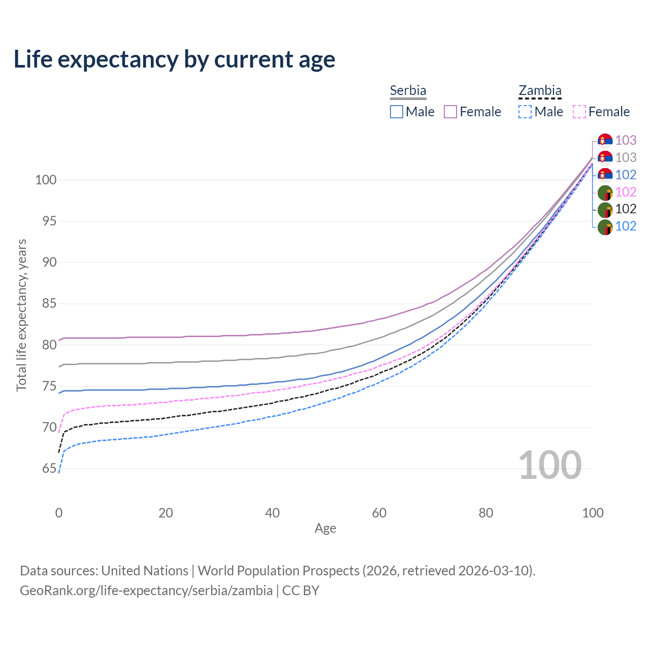 This life expectancy calculator shows the odds of living to 100, 95, 90, and below based on current age for both males and females in Serbia and Zambia, along with mean and median age of death. The calculations are based on the 2026 life tables (actuarial tables) from the UN World Population Prospects.