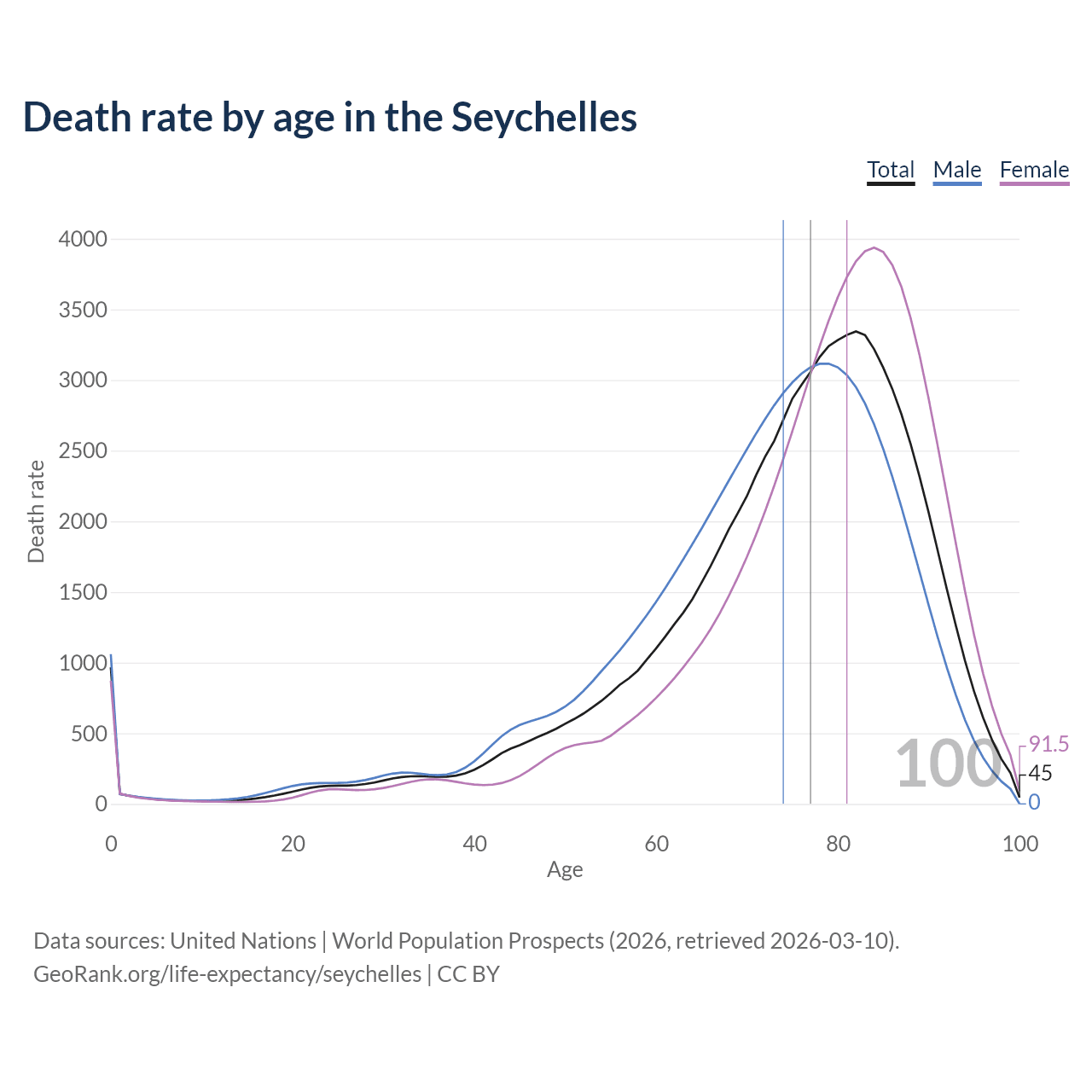 In the Seychelles, the most probable age of death — the age at which the highest number of deaths occur — is 82 for both sexes combined, 79 for males, and 84 for females. Vertical lines mark the median age of death: 73.9 for men, 80.6 for women, and 77 combined, meaning only half of each cohort is expected to live past that age.