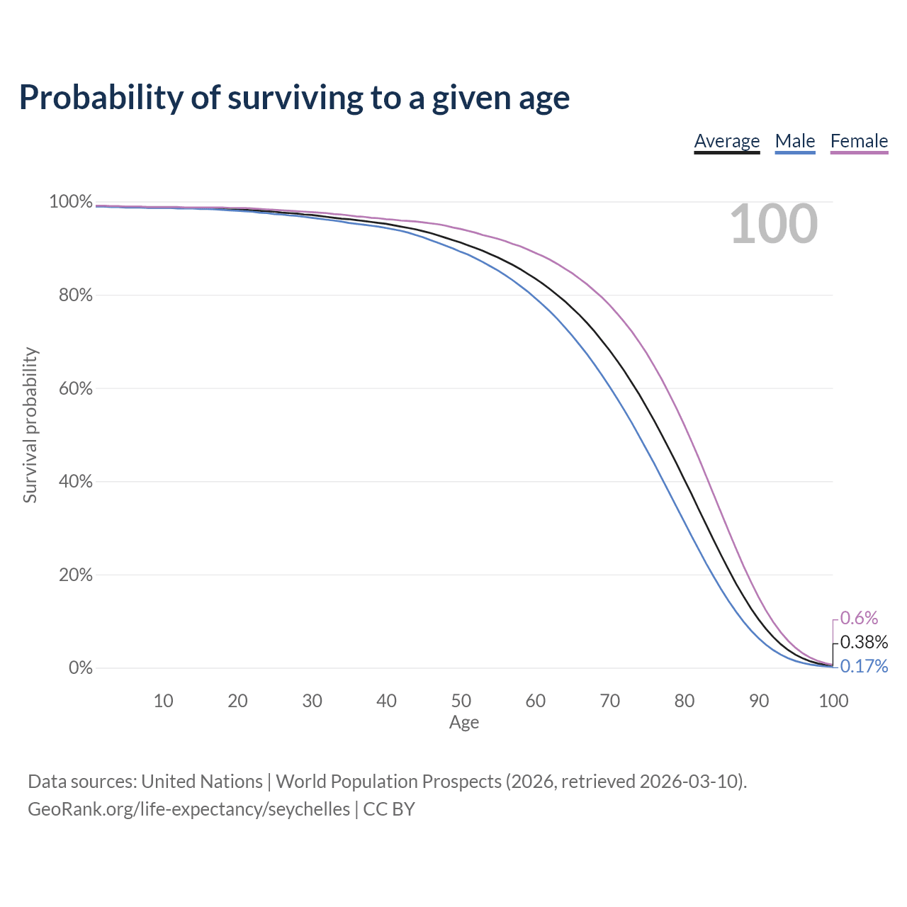 This life expectancy calculator shows the odds of living to 100, 95, 90, and below based on current age for both males and females in the Seychelles, along with mean and median age of death. The calculations are based on the 2026 life tables (actuarial tables) from the UN World Population Prospects.