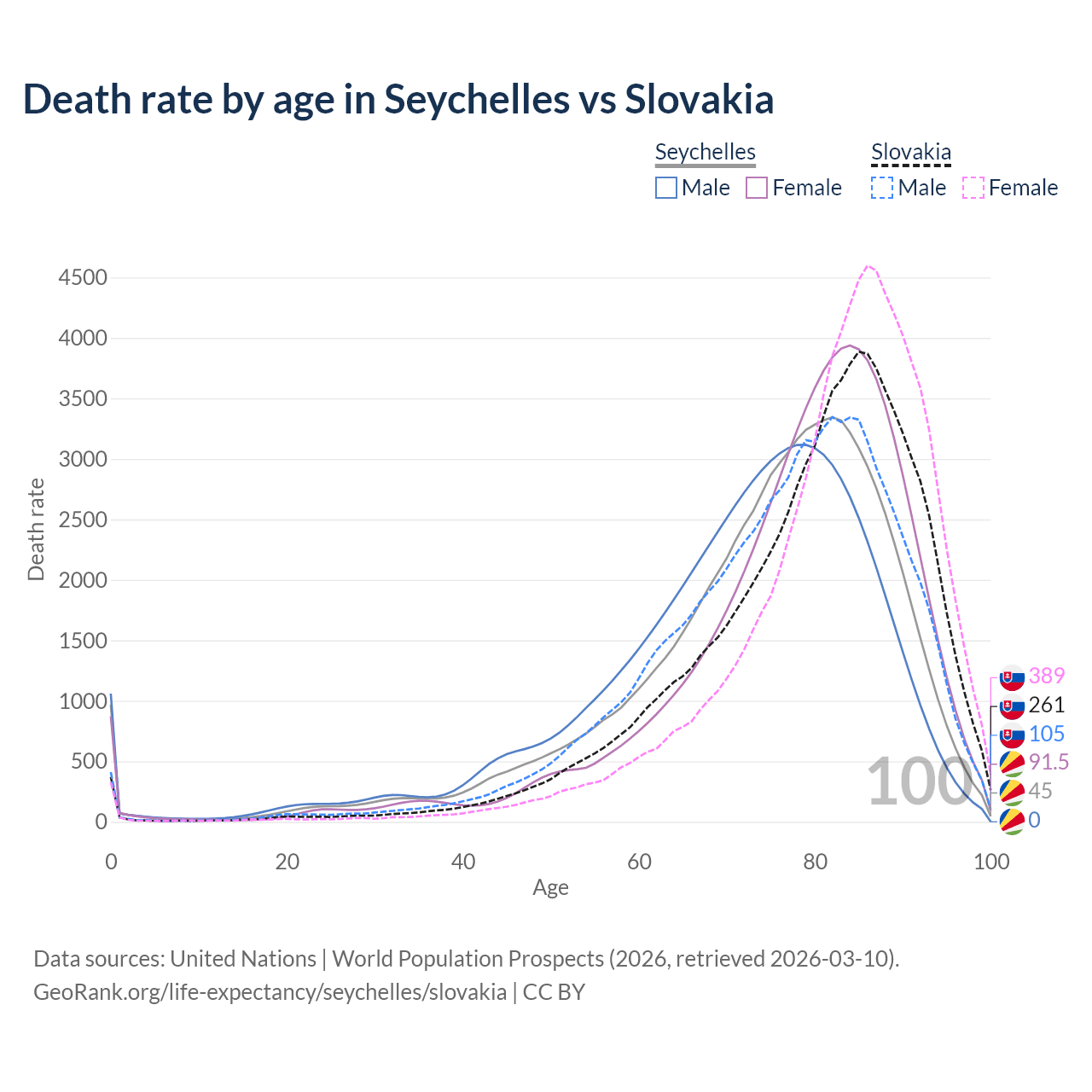 In the Seychelles, the most common age of death is 82, compared to 85 in Slovakia. The median age of death is 77 in the Seychelles and 82 in Slovakia, meaning only half of each cohort is expected to live past that age.