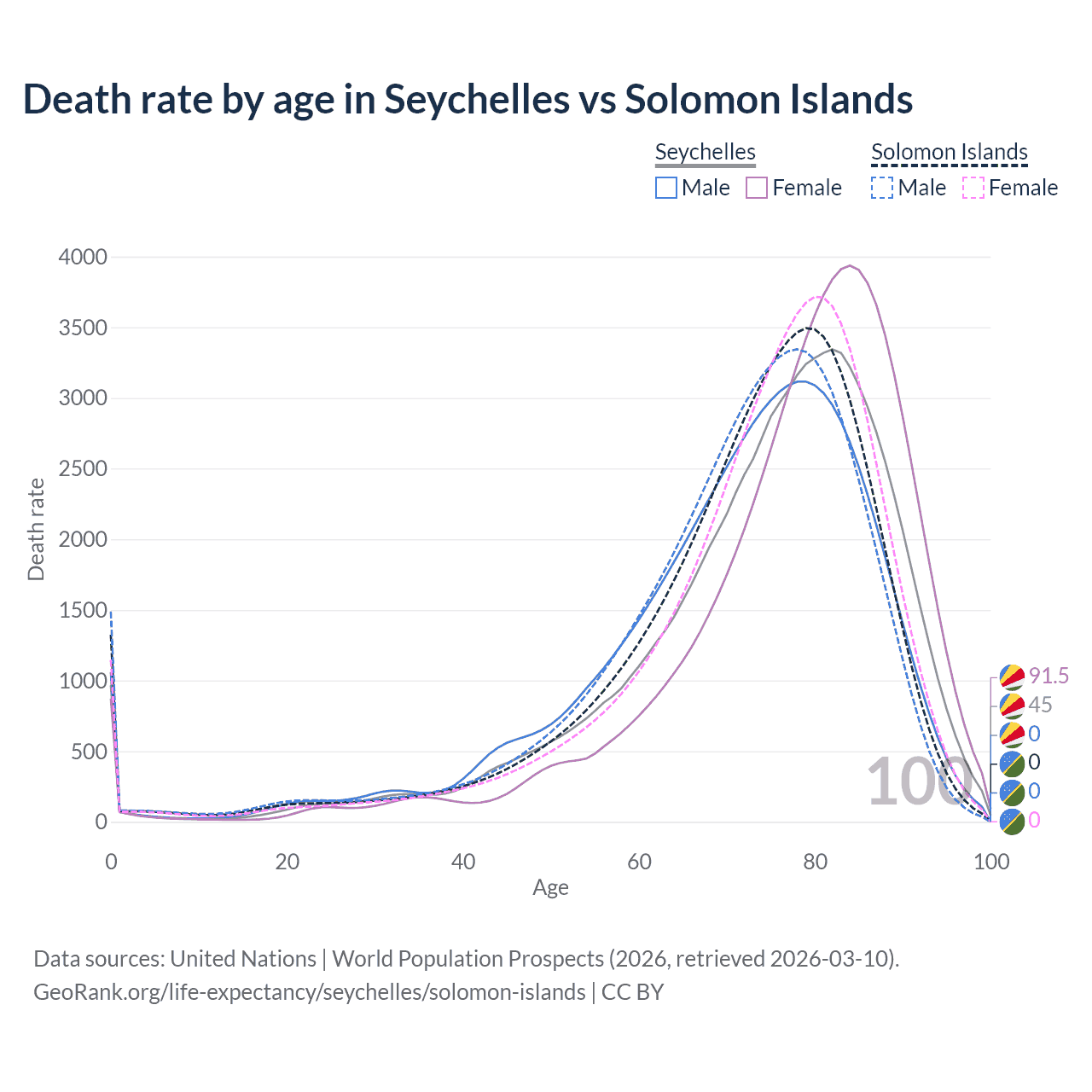 In the Seychelles, the most common age of death is 82, compared to 79 in the Solomon Islands. The median age of death is 77 in the Seychelles and 74.9 in the Solomon Islands, meaning only half of each cohort is expected to live past that age.