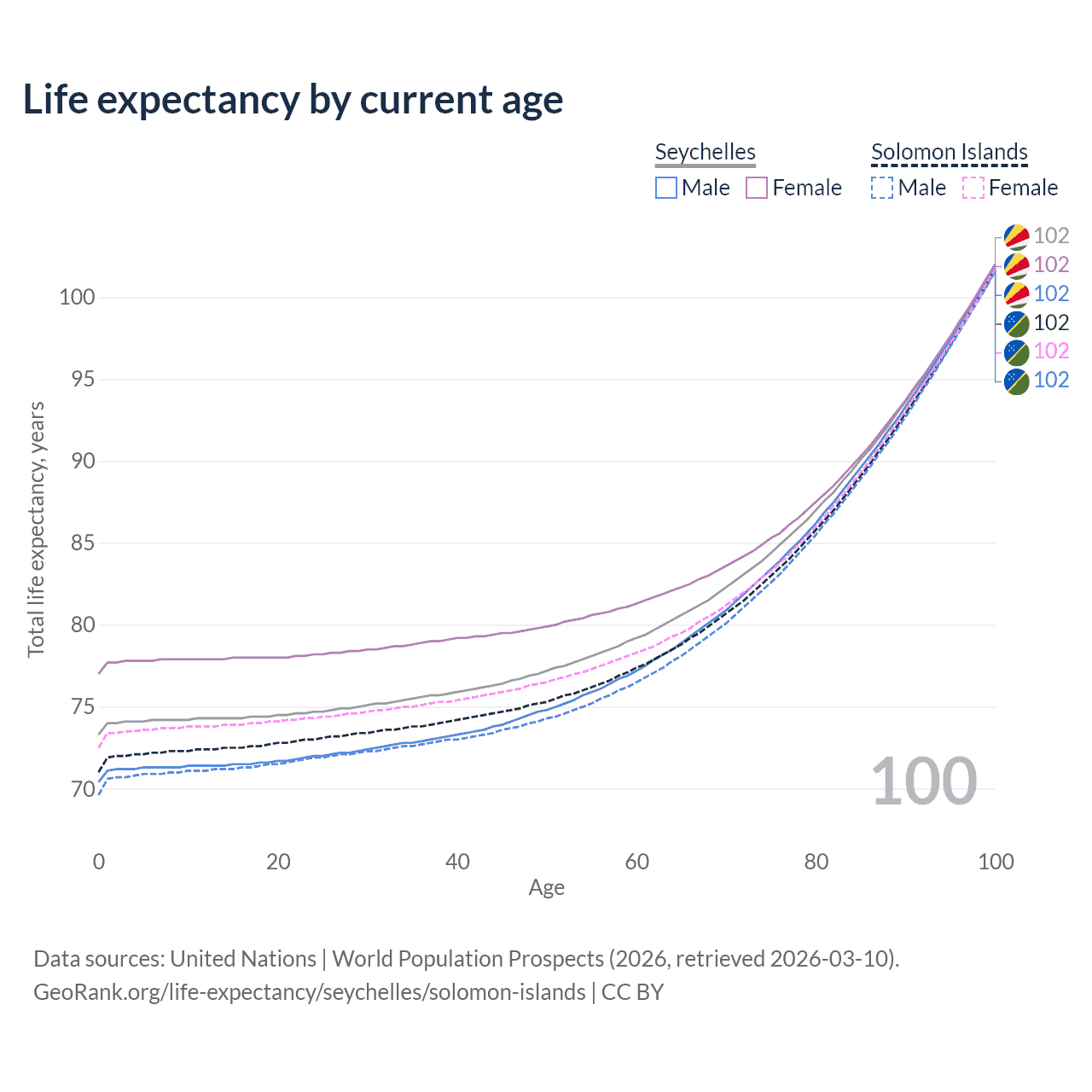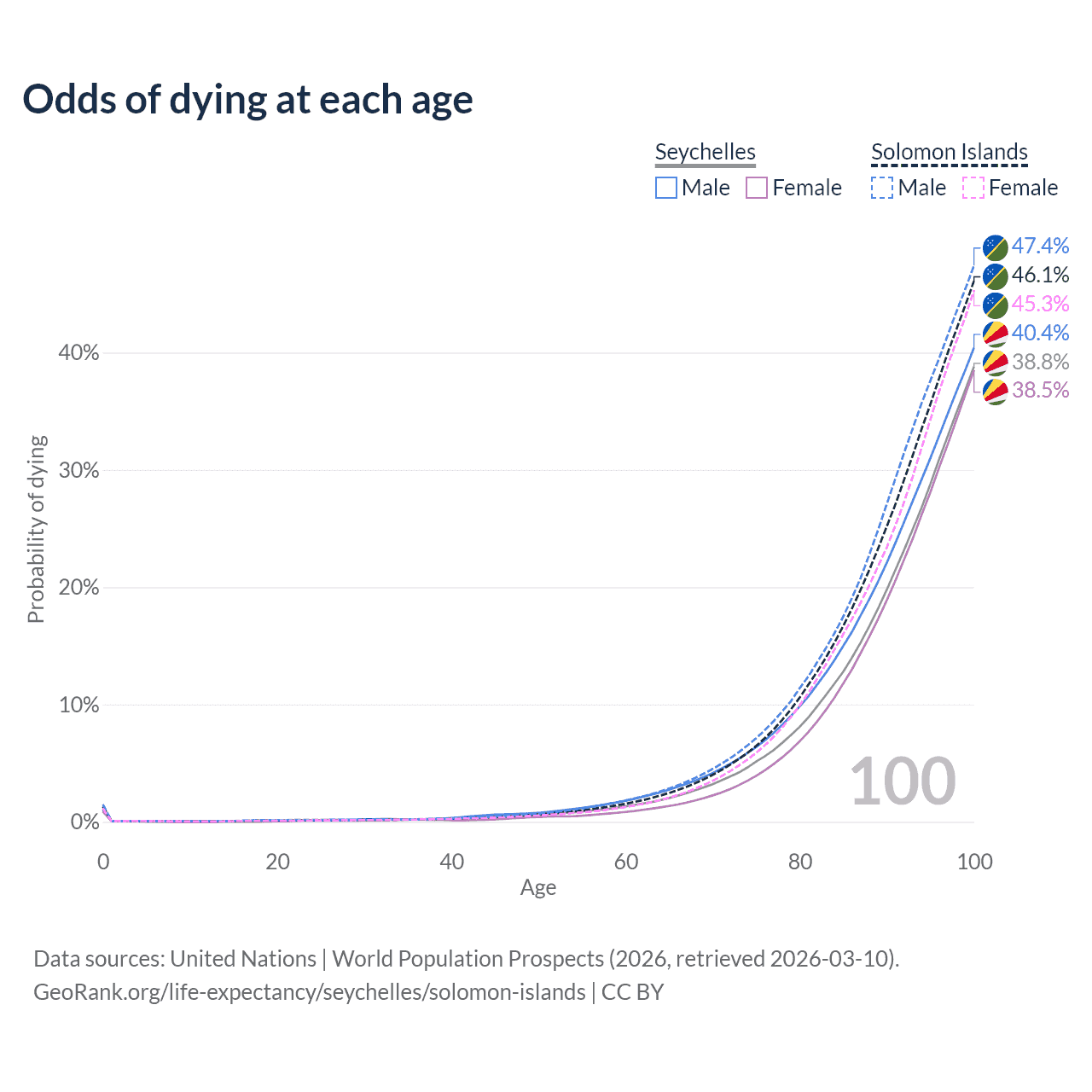 This life expectancy calculator shows the odds of living to 100, 95, 90, and below based on current age for both males and females in the Seychelles and the Solomon Islands, along with mean and median age of death. The calculations are based on the 2026 life tables (actuarial tables) from the UN World Population Prospects.