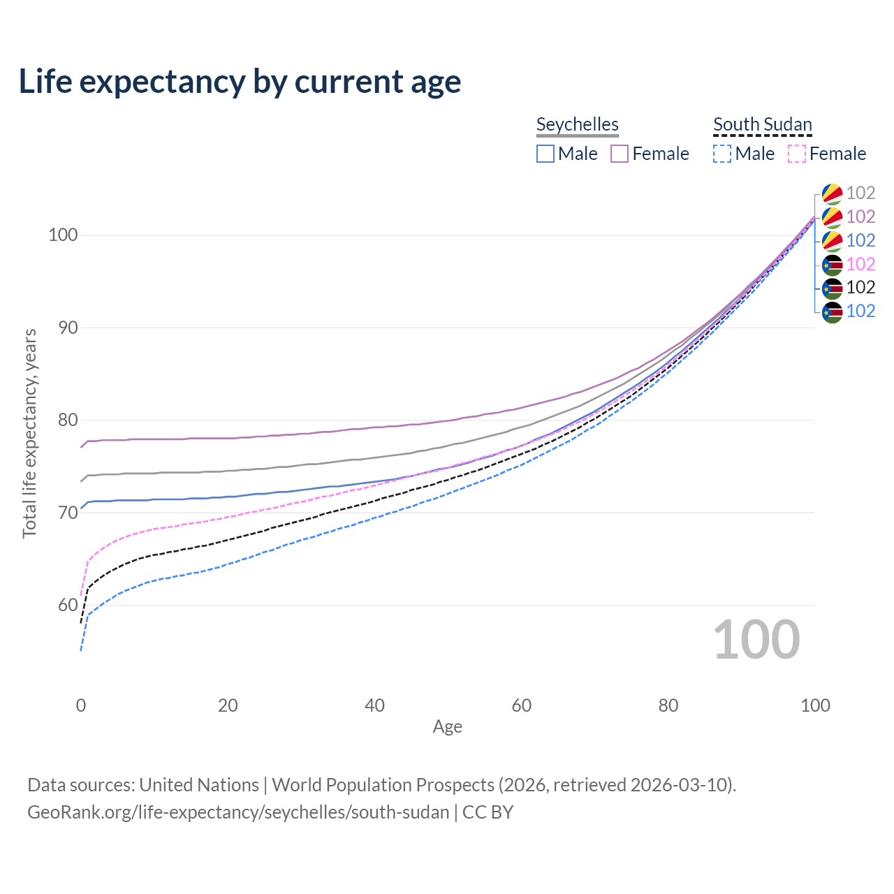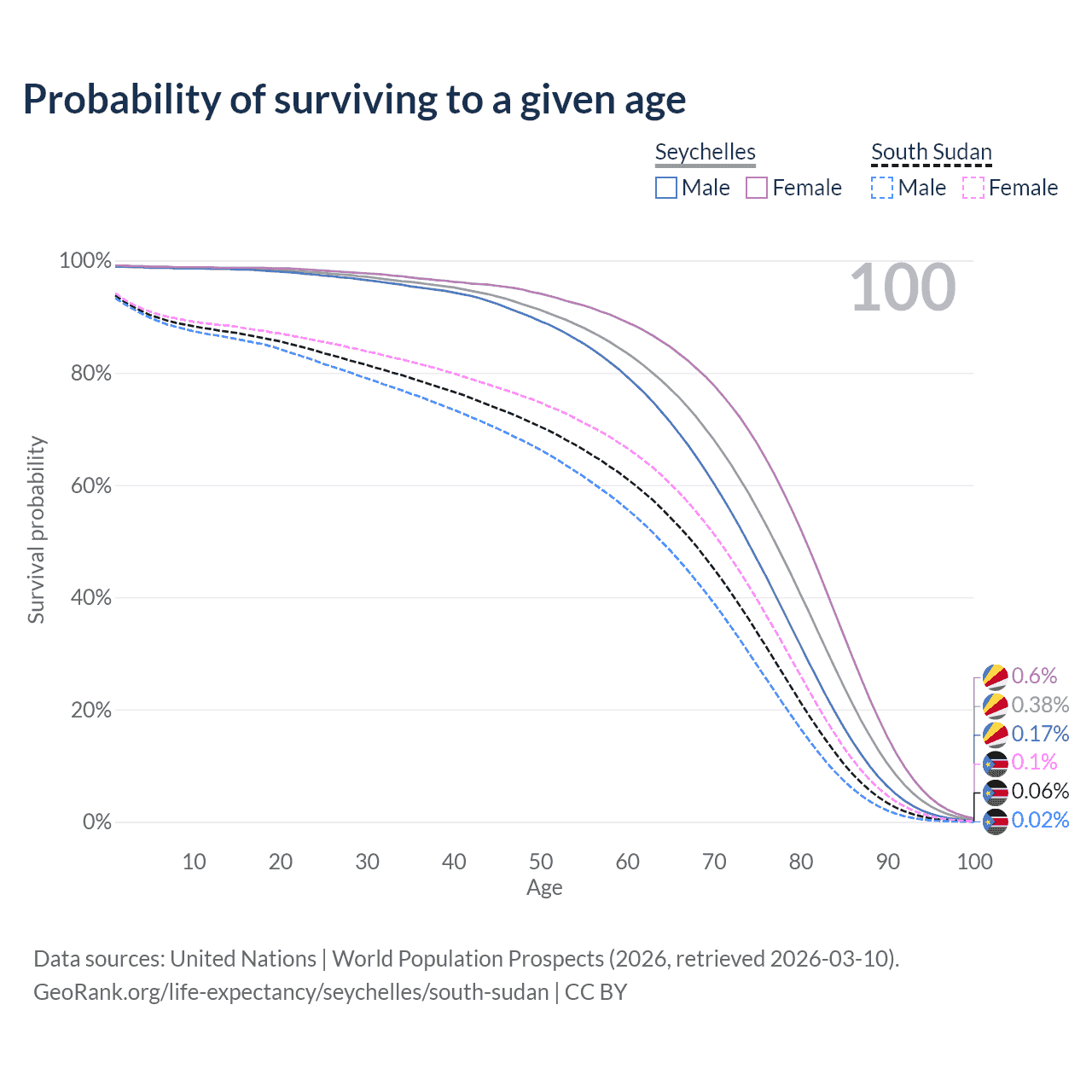 This life expectancy calculator shows the odds of living to 100, 95, 90, and below based on current age for both males and females in the Seychelles and South Sudan, along with mean and median age of death. The calculations are based on the 2026 life tables (actuarial tables) from the UN World Population Prospects.