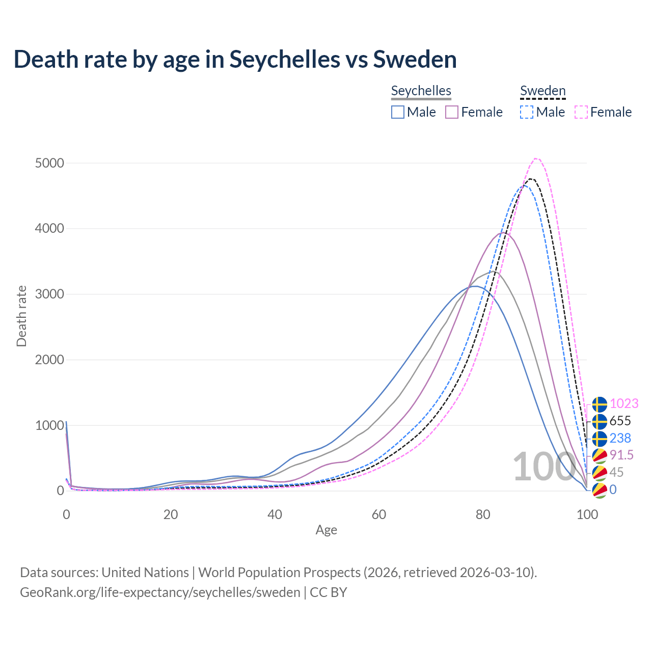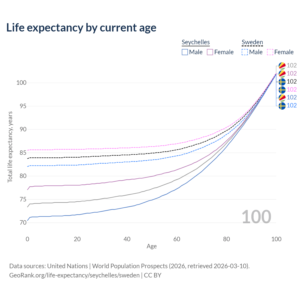 This life expectancy calculator shows the odds of living to 100, 95, 90, and below based on current age for both males and females in the Seychelles and Sweden, along with mean and median age of death. The calculations are based on the 2026 life tables (actuarial tables) from the UN World Population Prospects.