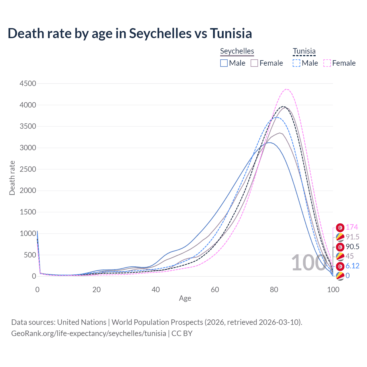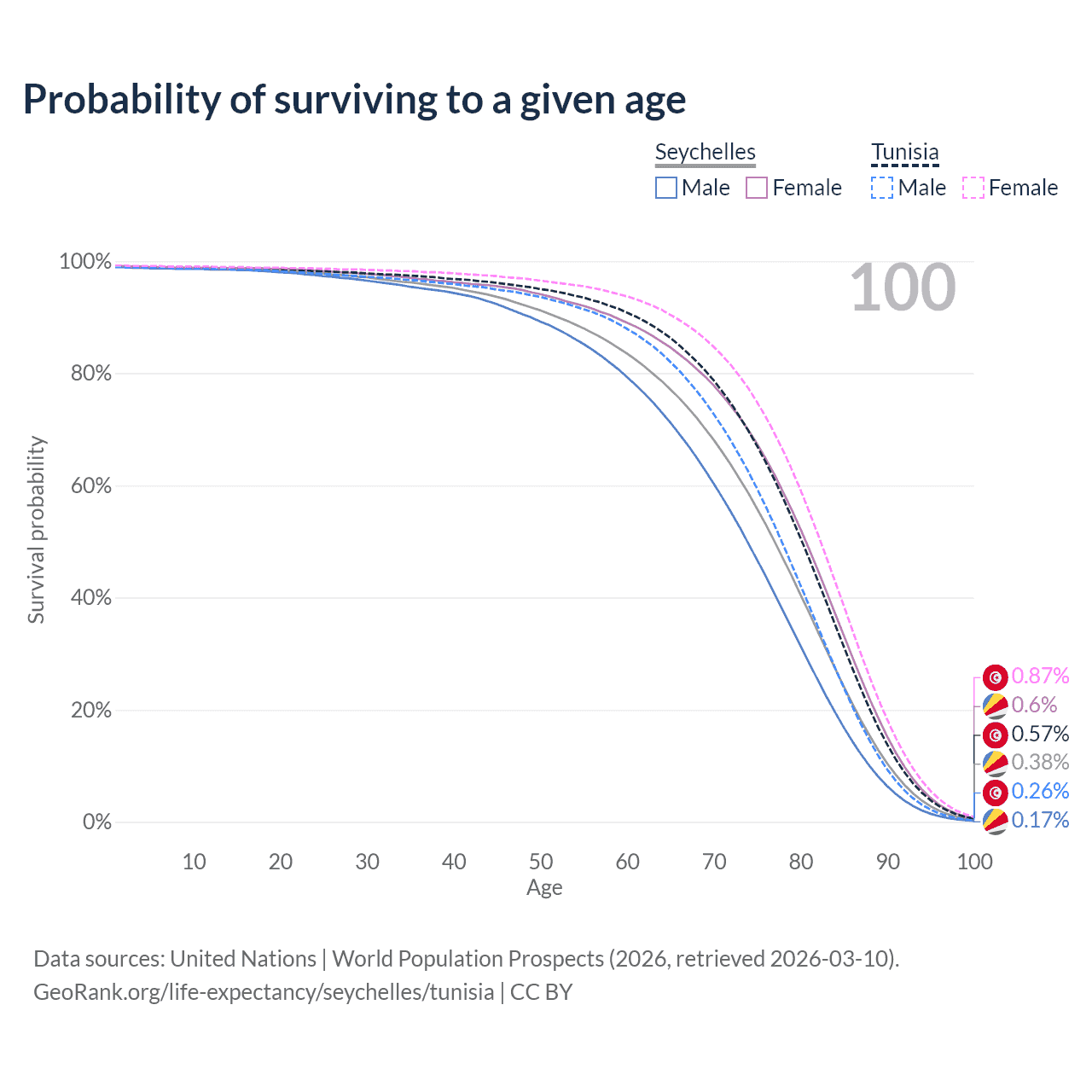This life expectancy calculator shows the odds of living to 100, 95, 90, and below based on current age for both males and females in the Seychelles and Tunisia, along with mean and median age of death. The calculations are based on the 2026 life tables (actuarial tables) from the UN World Population Prospects.