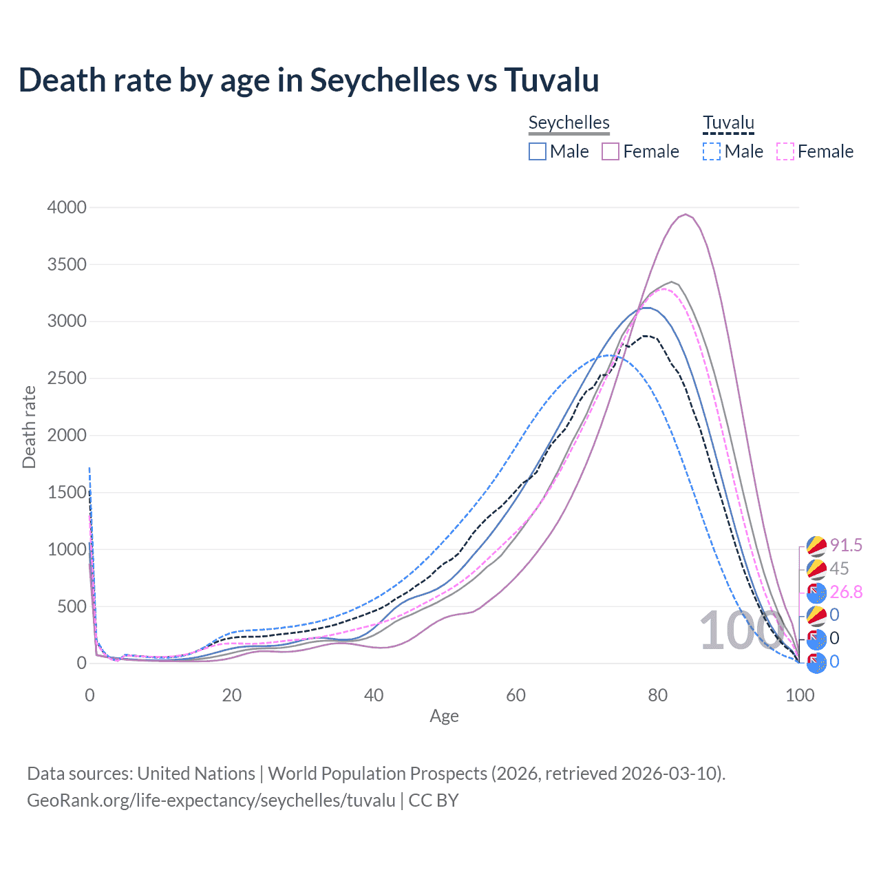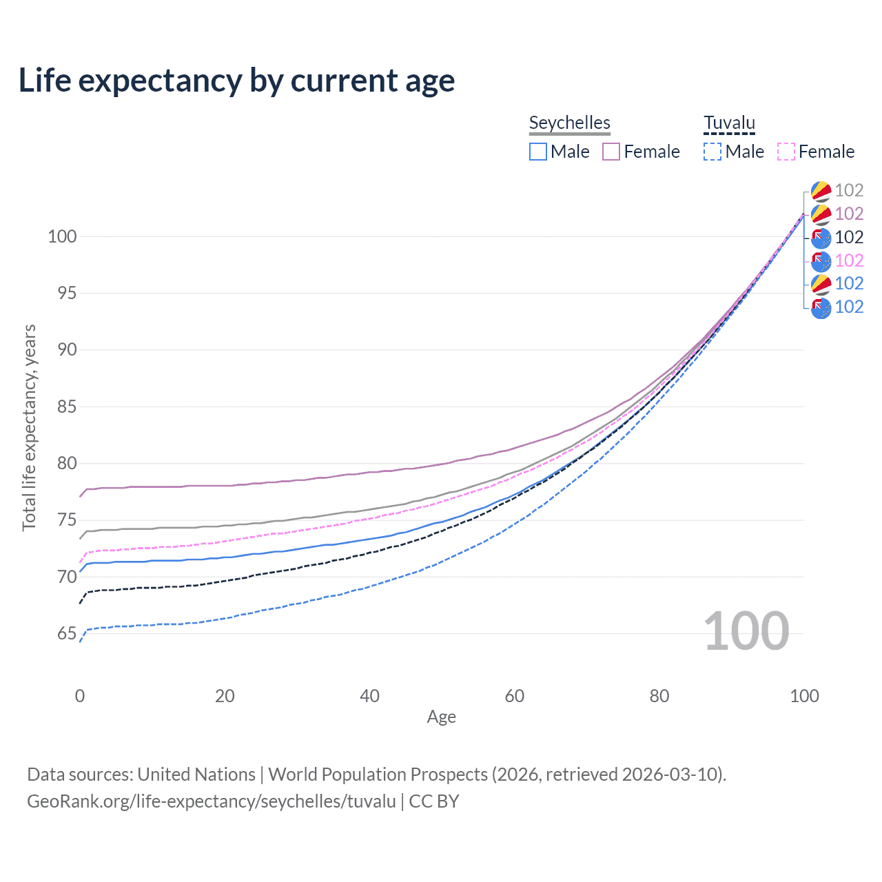 This life expectancy calculator shows the odds of living to 100, 95, 90, and below based on current age for both males and females in the Seychelles and Tuvalu, along with mean and median age of death. The calculations are based on the 2026 life tables (actuarial tables) from the UN World Population Prospects.