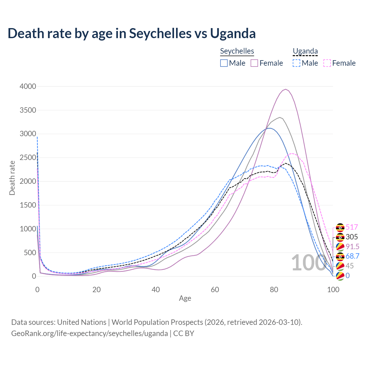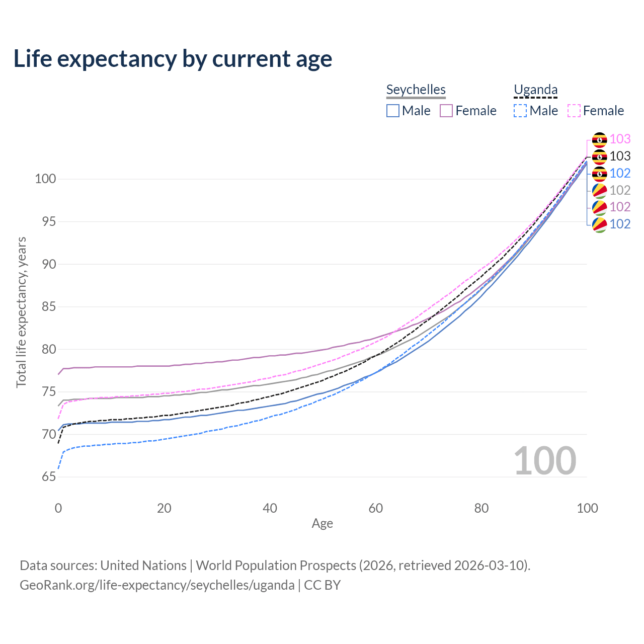 This life expectancy calculator shows the odds of living to 100, 95, 90, and below based on current age for both males and females in the Seychelles and Uganda, along with mean and median age of death. The calculations are based on the 2026 life tables (actuarial tables) from the UN World Population Prospects.