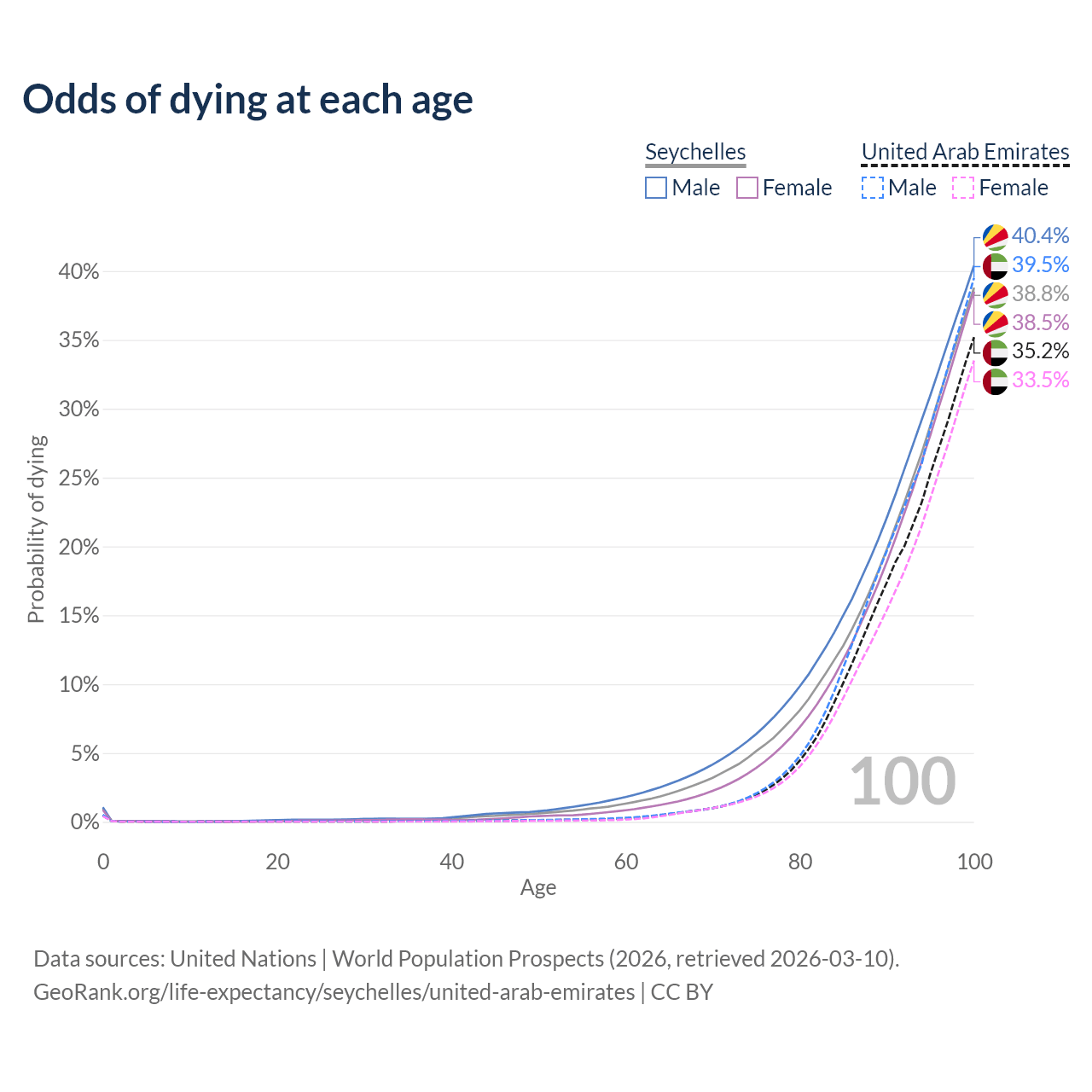 This life expectancy calculator shows the odds of living to 100, 95, 90, and below based on current age for both males and females in the Seychelles and the United Arab Emirates, along with mean and median age of death. The calculations are based on the 2026 life tables (actuarial tables) from the UN World Population Prospects.