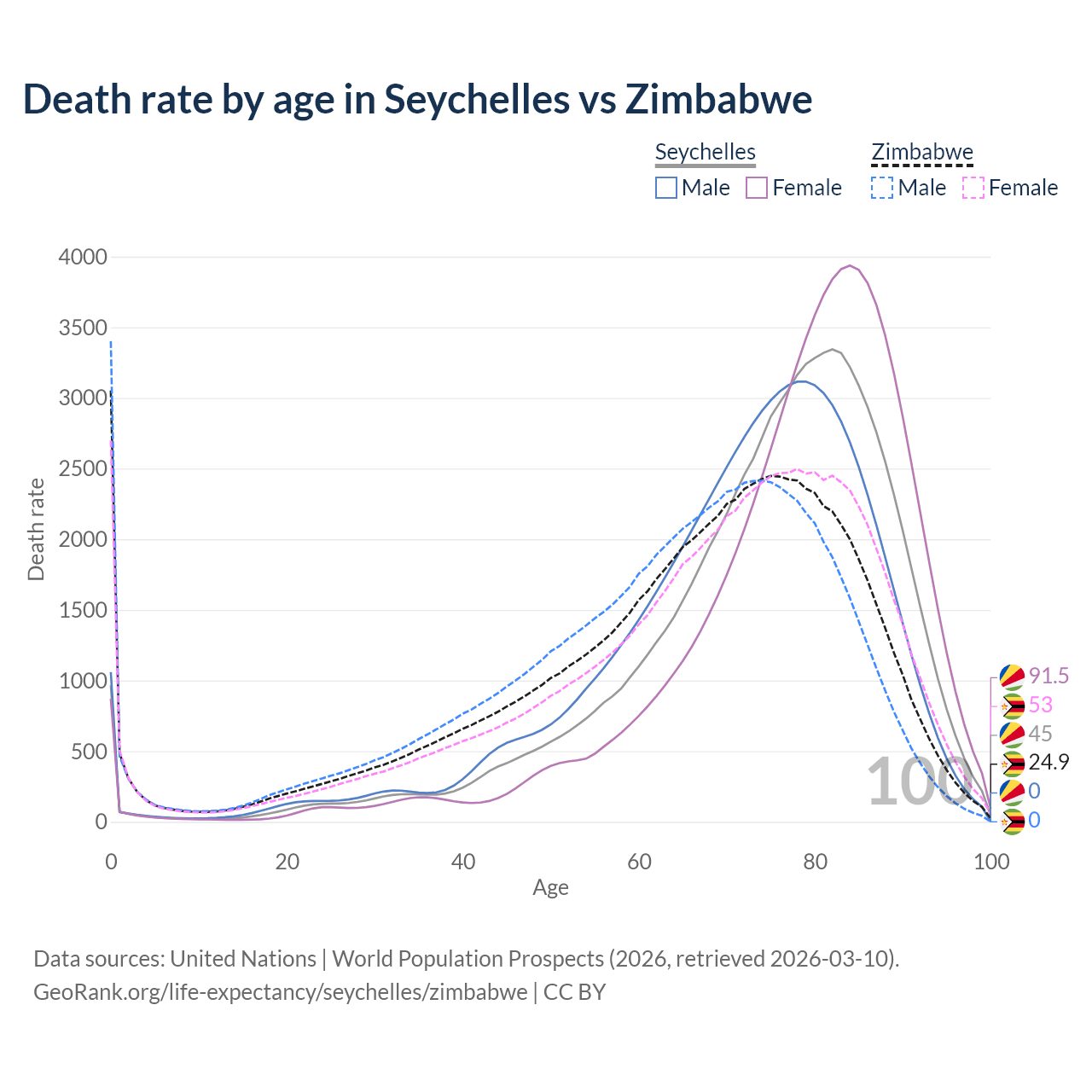 In the Seychelles, the most common age of death is 82, compared to 0 in Zimbabwe. The median age of death is 77 in the Seychelles and 68.8 in Zimbabwe, meaning only half of each cohort is expected to live past that age.