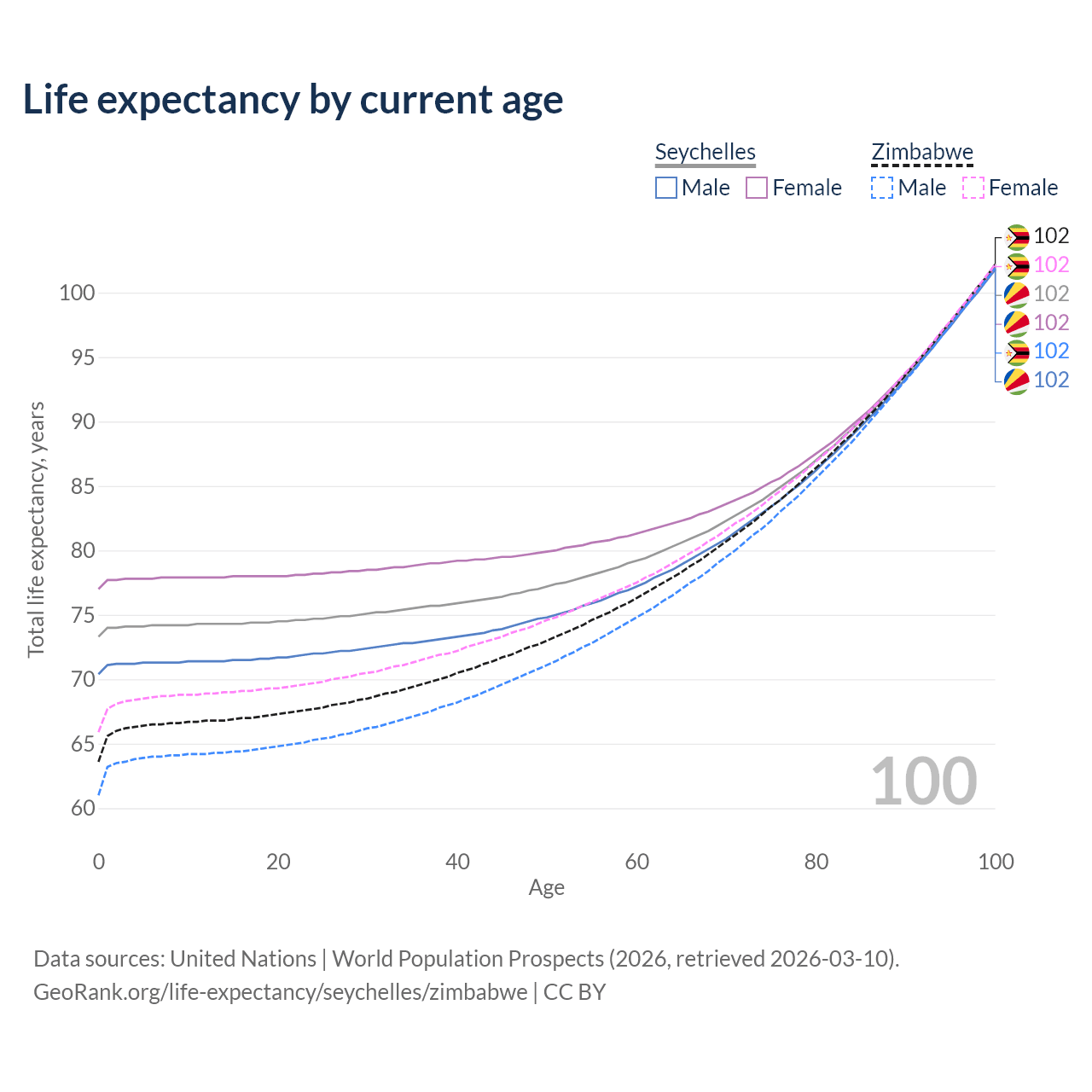 This life expectancy calculator shows the odds of living to 100, 95, 90, and below based on current age for both males and females in the Seychelles and Zimbabwe, along with mean and median age of death. The calculations are based on the 2026 life tables (actuarial tables) from the UN World Population Prospects.